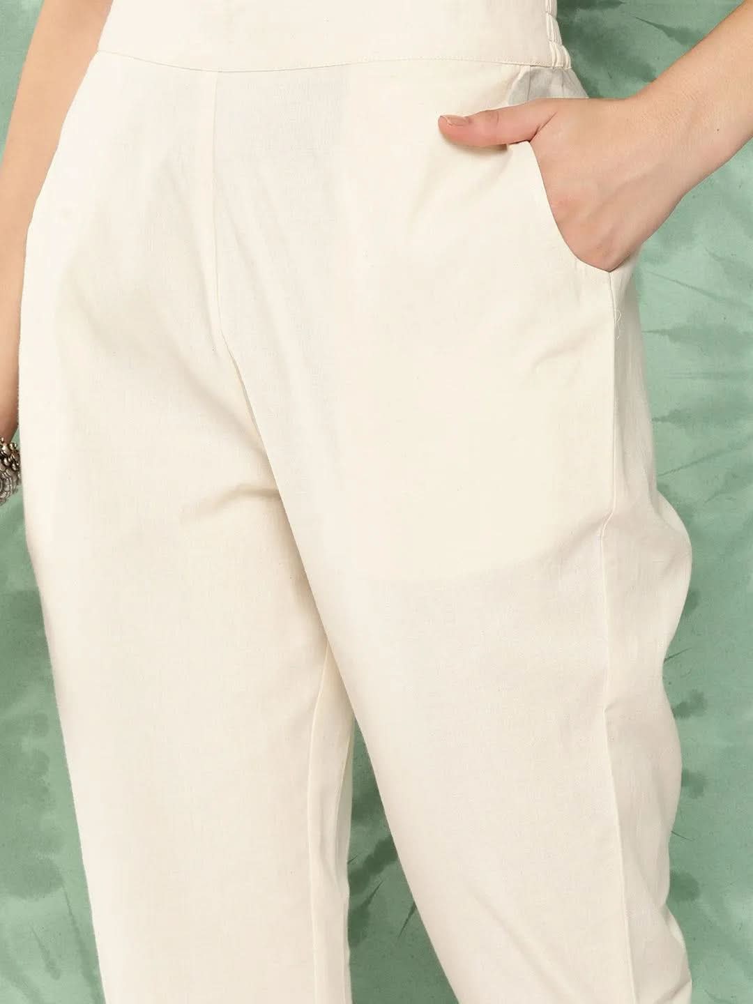 Our white solid-tone straight-fit trousers, crafted in comfortable cotton fabric, feature a partially elasticated waistband with a slip-on closure and roomy pockets. Adorned with schiffli detailing, this elegant style is perfect for casual outings.