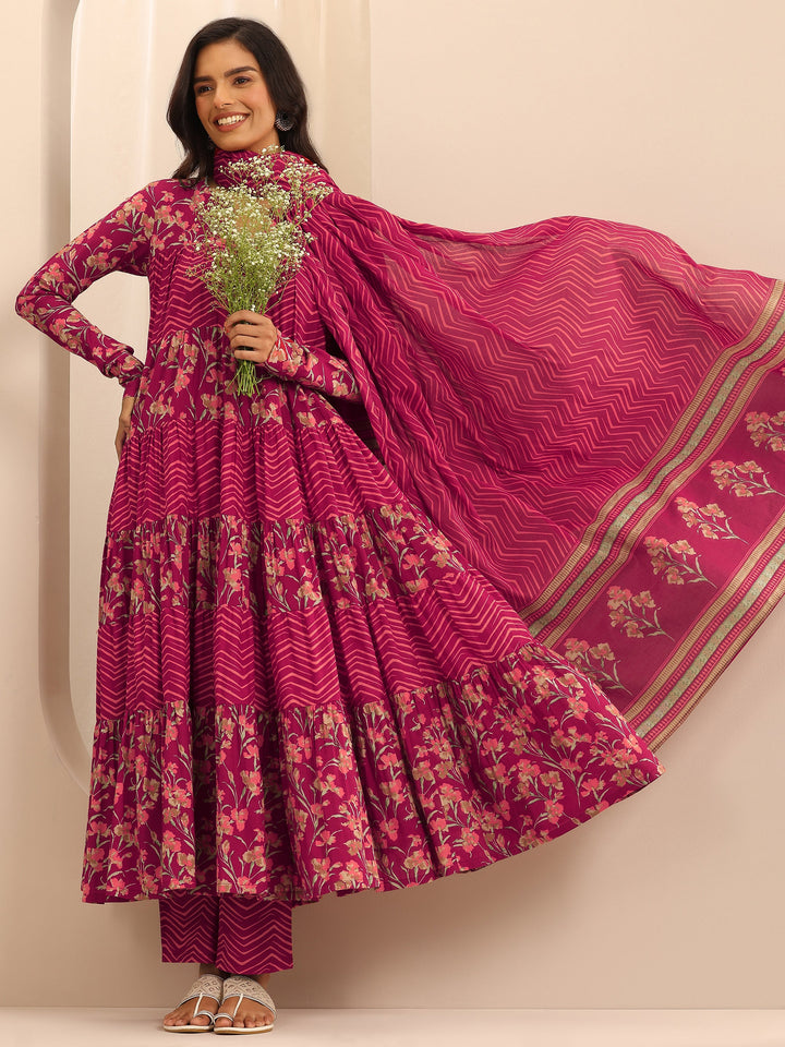 Red Printed Cotton Anarkali Suit Set With Dupatta