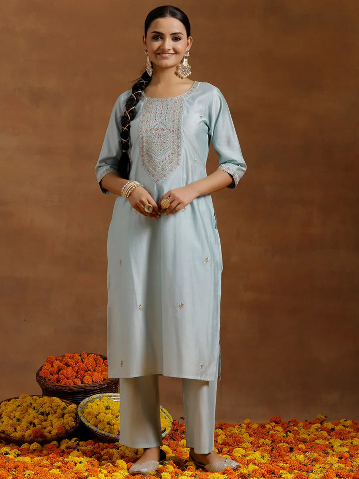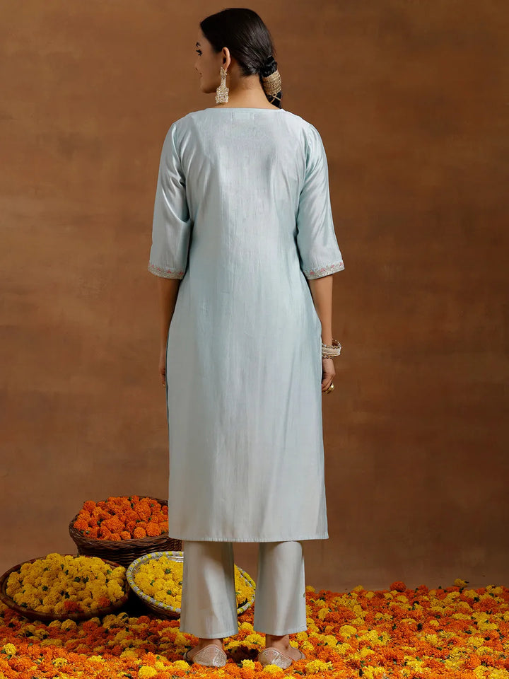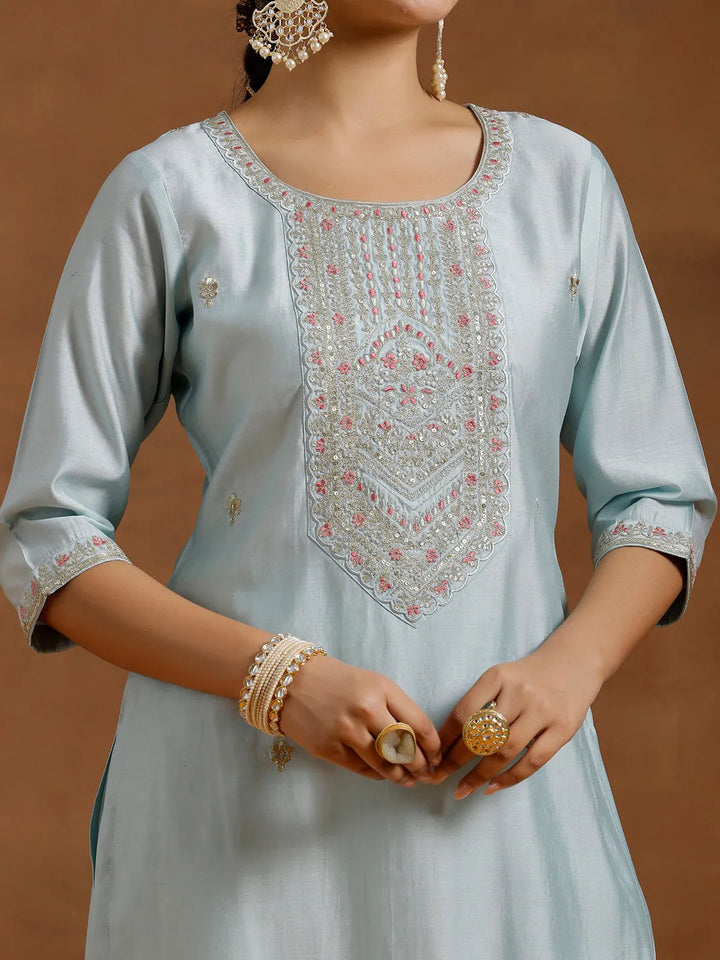 Our 2-piece blue embroidered silk blend straight kurta set features a kurta with a round neckline, three-quarter sleeves, and a statement yoke. Complemented with trousers with a fully elasticated waistband and roomy pockets, and a dupatta. Highlighted with sequins and thread work, this style is perfect for festive celebrations.