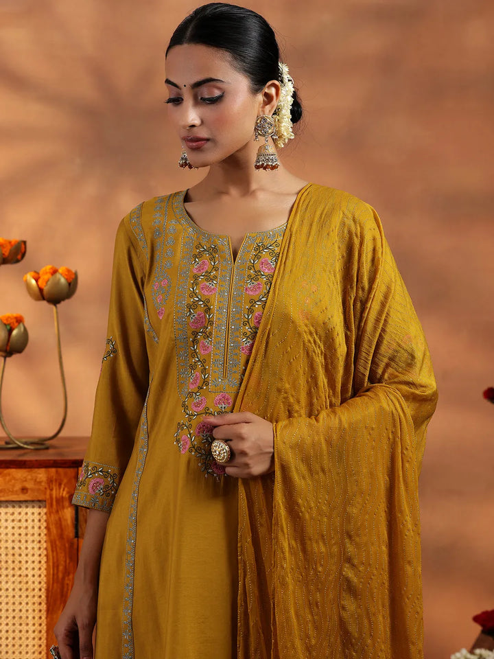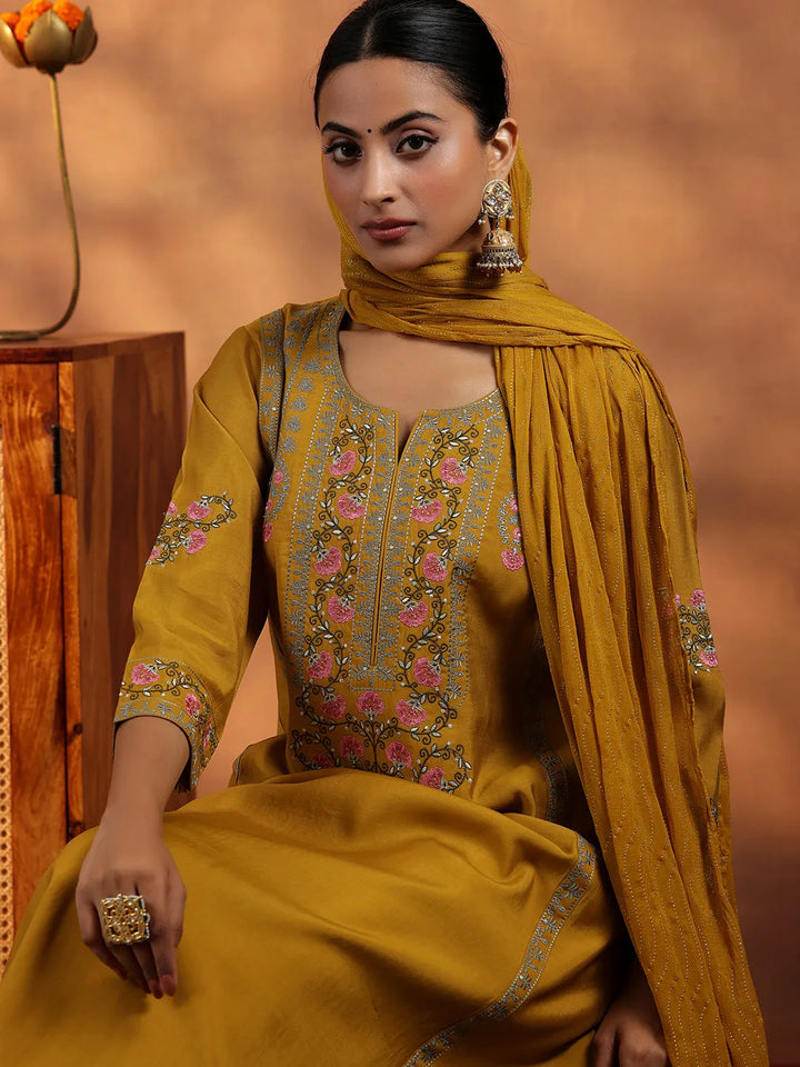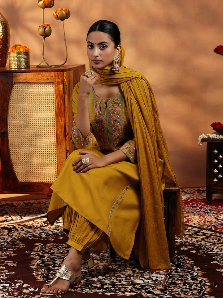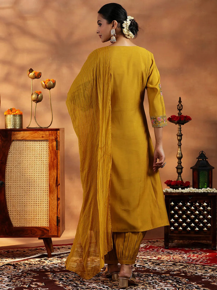 Mustard Embroidered Silk Blend A-Line Kurta With Salwar & Dupatta