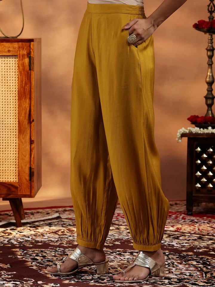 Our 2-piece mustard yellow embroidered silk blend kurta set features an A-line kurta with a notched neckline, three-quarter sleeves, and statement yoke. Complemented with hem-cuffed Salwar trousers with a partially elasticated waistband and roomy pockets. Highlighted with intricate thread work and sequins, this style is perfect for light festivities.