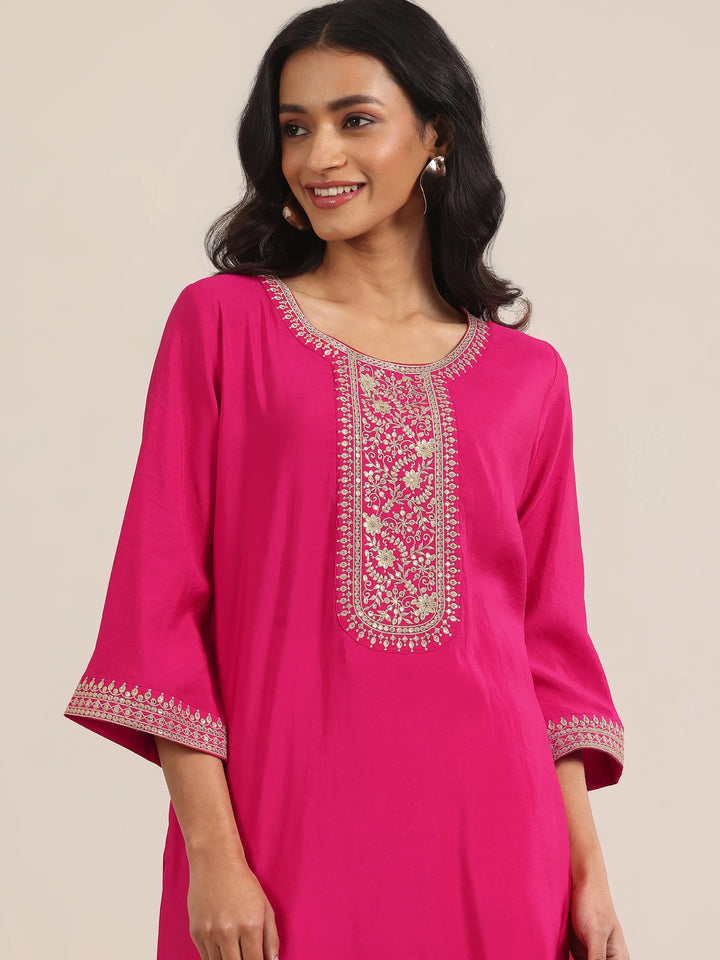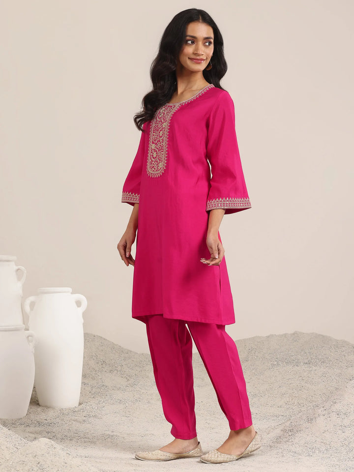 Our 3-piece pink yoke design silk blend straight suit set features a kurta with a round neckline, three-quarter flared sleeves, and a statement yoke. Complemented with trousers with a partially elasticated waistband and roomy pockets, and a dupatta. Highlighted with intricate thread work and sequins, this style is perfect for light festivities.