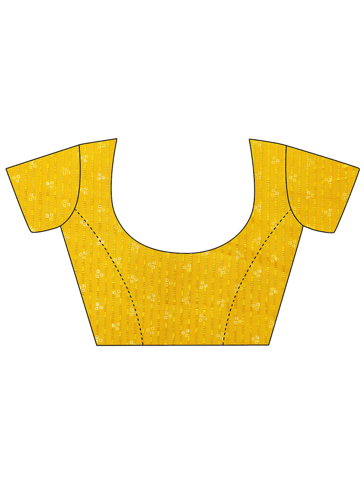 Our yellow printed chiffon saree features captivating leheriya-inspired print. Complemented with a stitched blouse. This charming saree is perfect for festive celebrations.