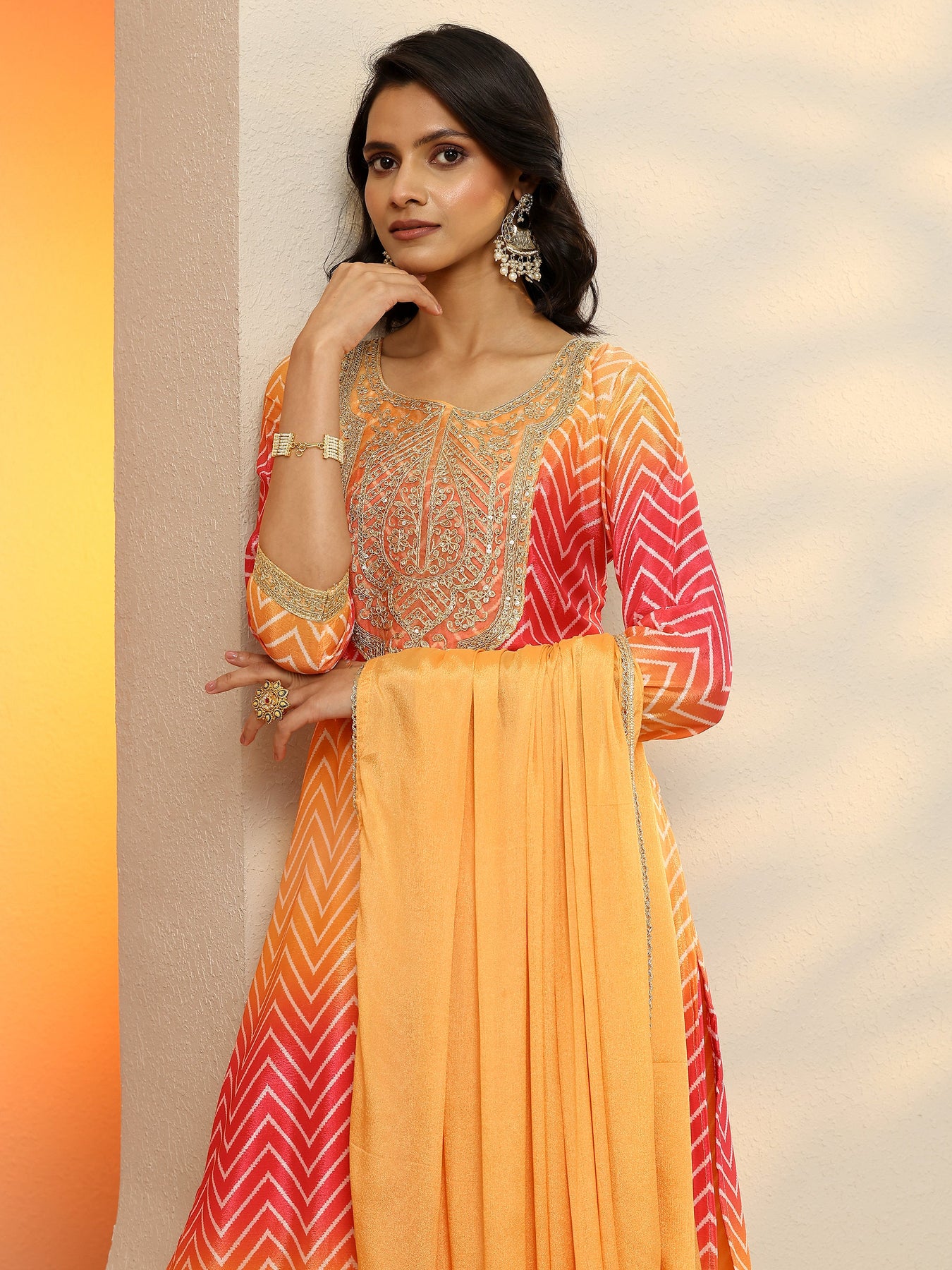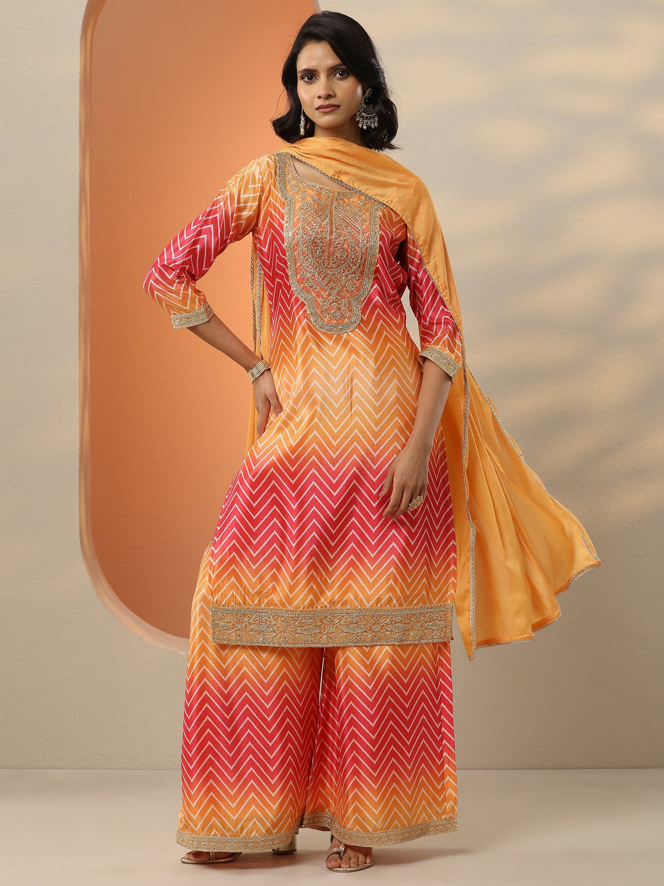 Orange Printed Chinon Straight Suit Set With Dupatta