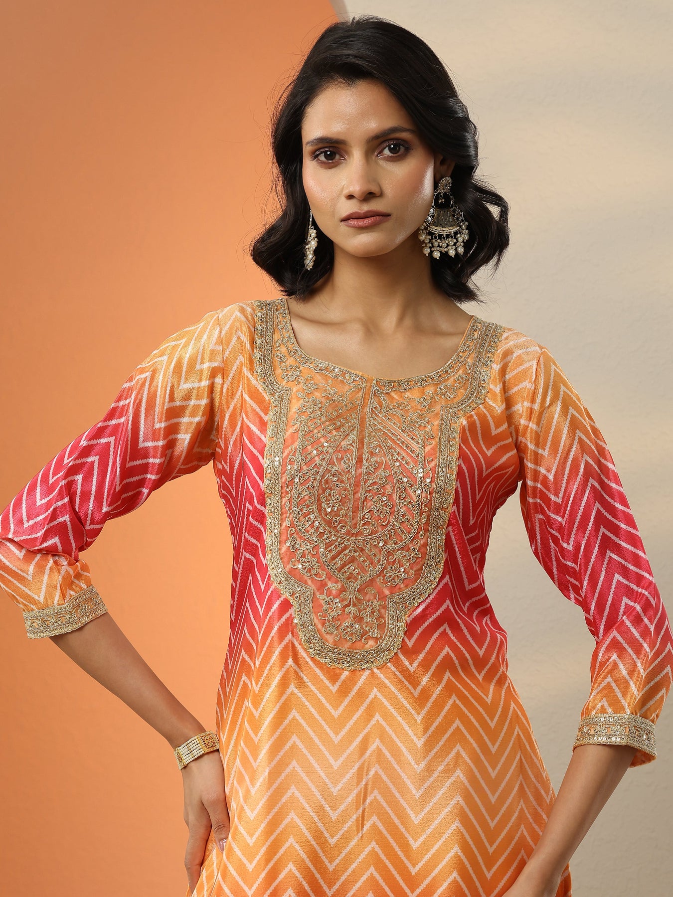 Our 3-piece orange and pink Chinon kurta set features a straight-fit kurta with a round neckline, regular sleeves, and statement yoke. Complemented with lining and palazzo pants with a partially elasticated waistband, and a solid dupatta. Adorned with Bandhani print, this style is perfect for festive occasions.