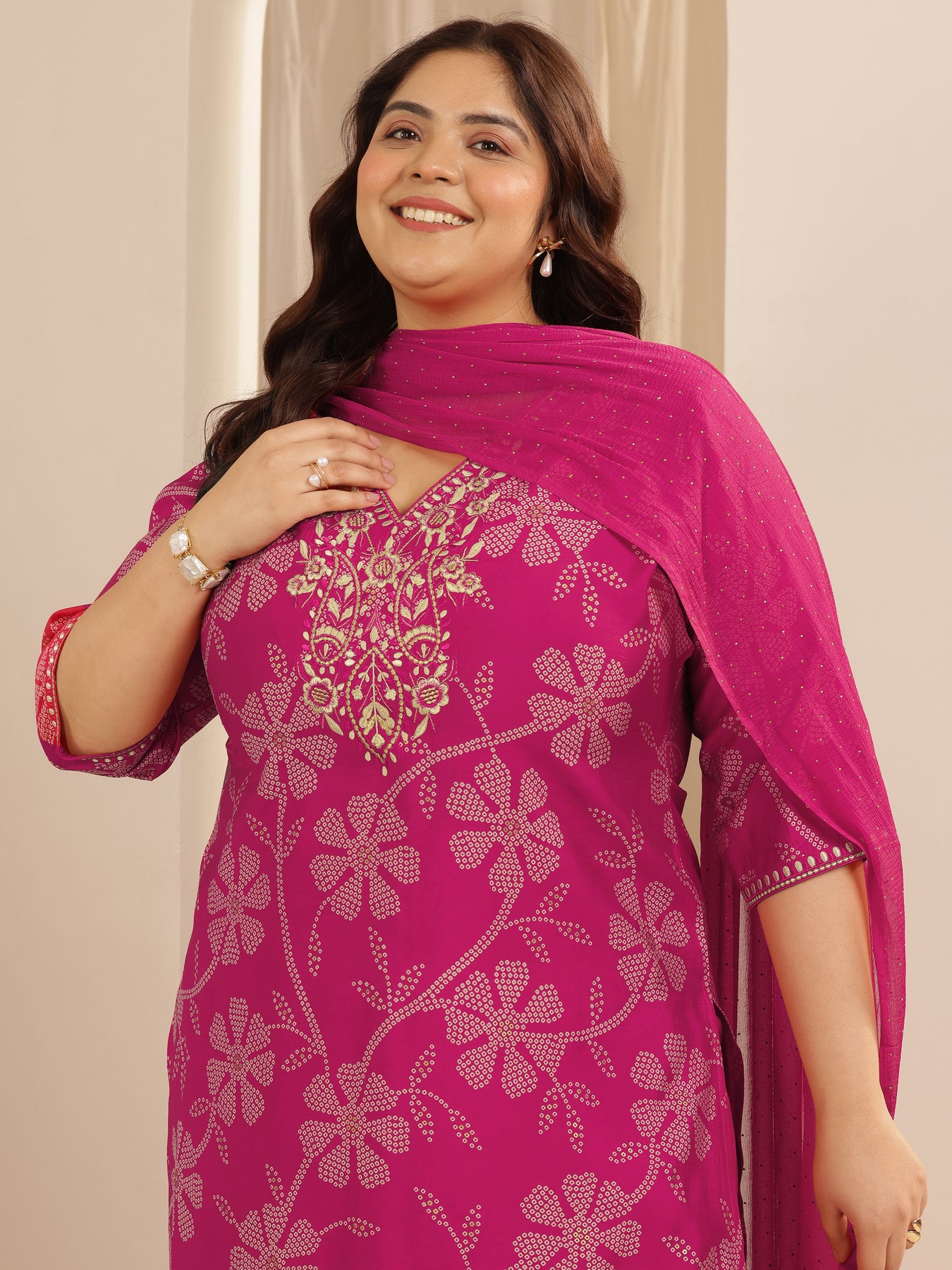 Libas Extra Love collection features Our signature designs in comfortable plus sizes. Our 3-piece Pink Silk Blend Straight-fit Kurta Set features a V-Neckline, Regular Sleeves, and statement yoke. Complemented with Straight Pants with a Partially Elasticated waistband and 2 pockets, and a Solid dupatta. Adorned with Floral Printed accents, this style is perfect for Semi Festive Wear.