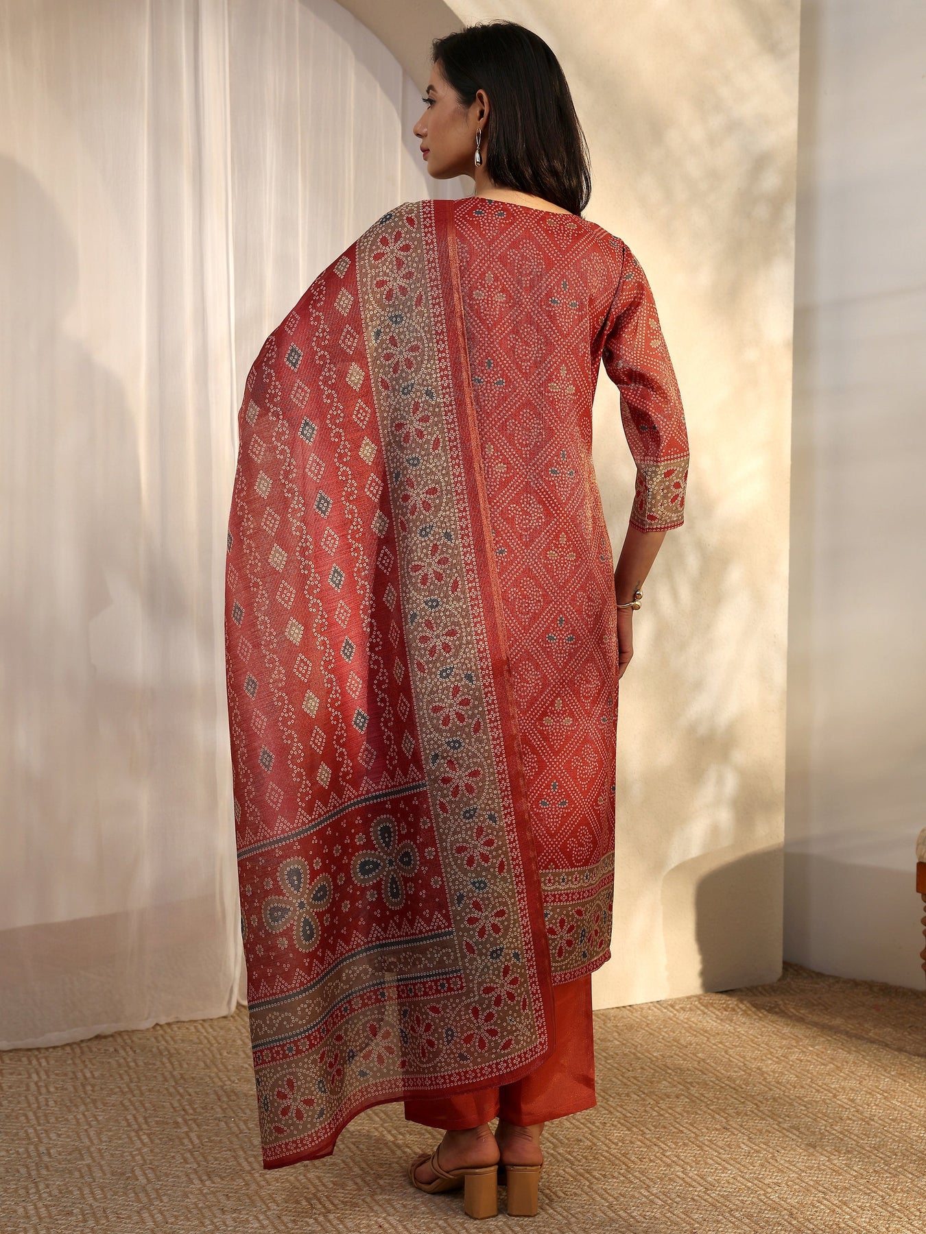 Rust Bandhani Printed Silk Blend Straight Suit Set With Dupatta