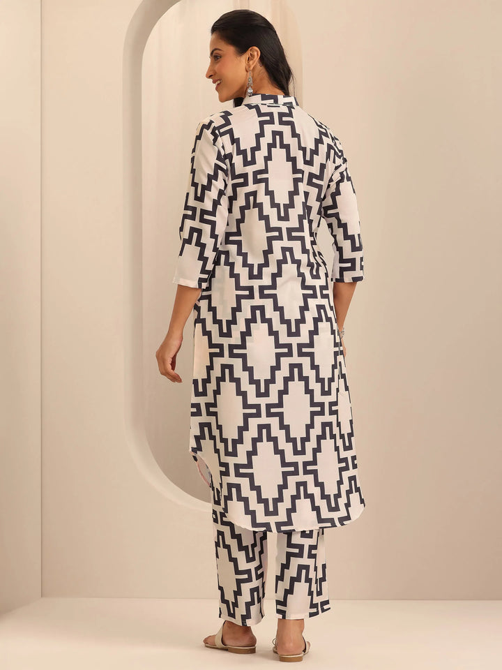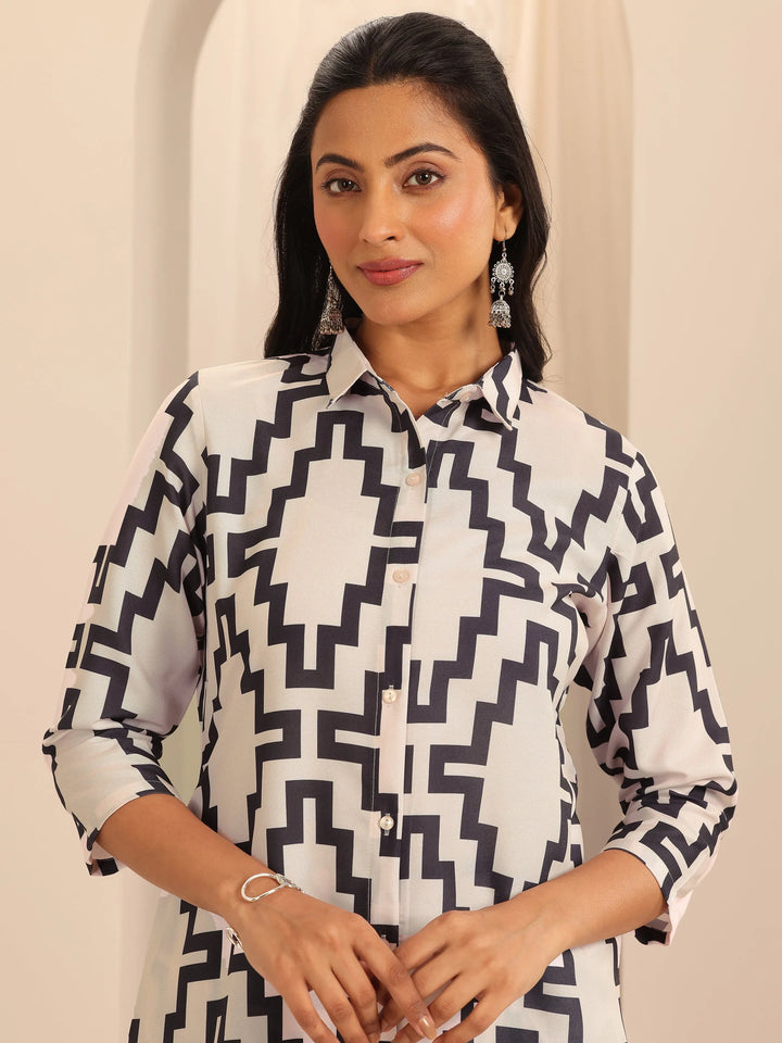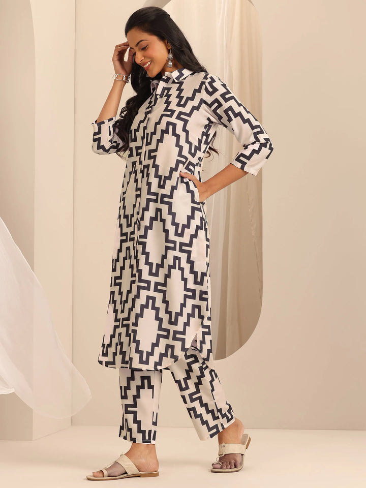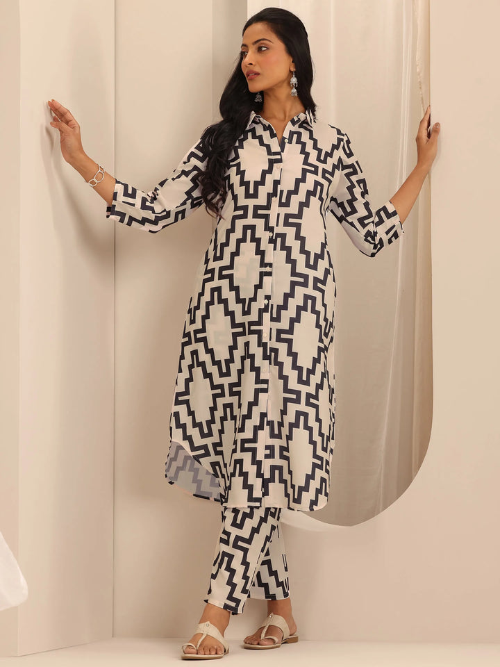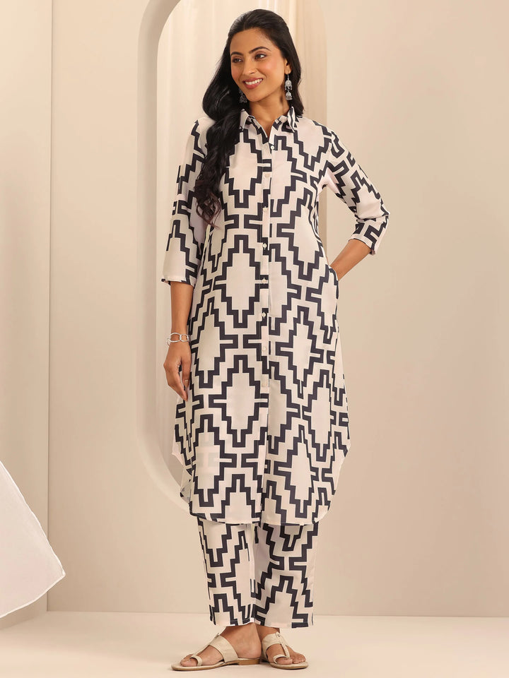 Our 2-piece black and white printed viscose co-ord set features a straight-fit shirt with a shirt collar neckline and three-quarter sleeves. Complemented with matching trousers with an Partially Elasticated waistband. Highlighted with abstract printed design, this style is perfect for casual wear.