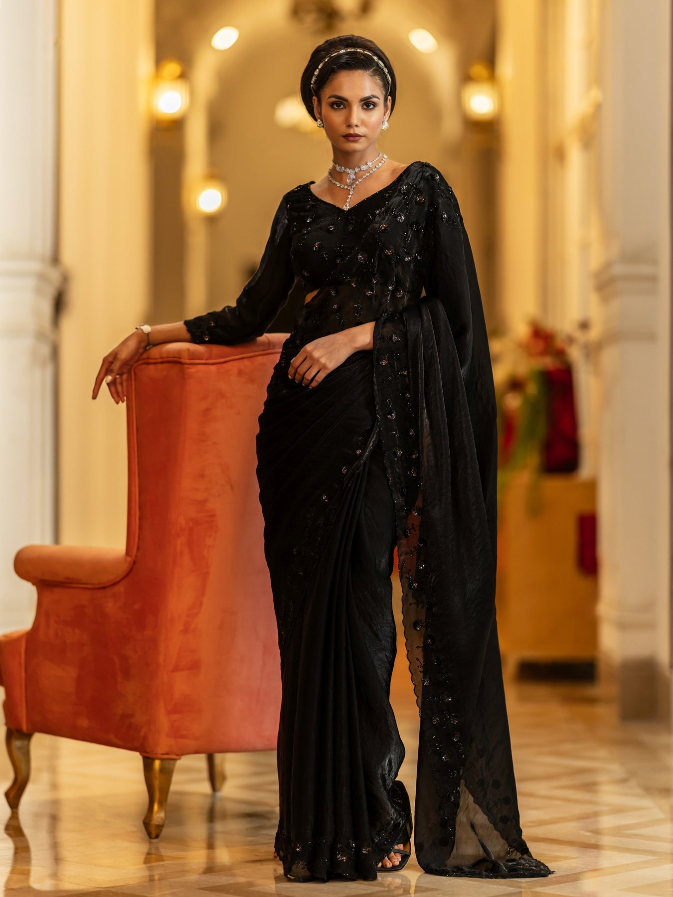 Black Embellished Satin Sarees With Unstitched Blouse Piece