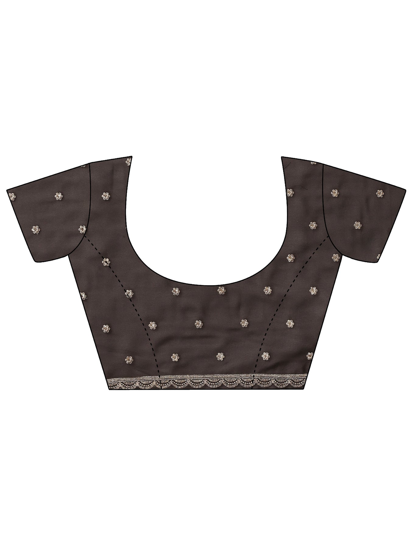 Our black georgette saree features captivating embellishments. Complemented with a stitched blouse. This charming saree is perfect for special occasions.