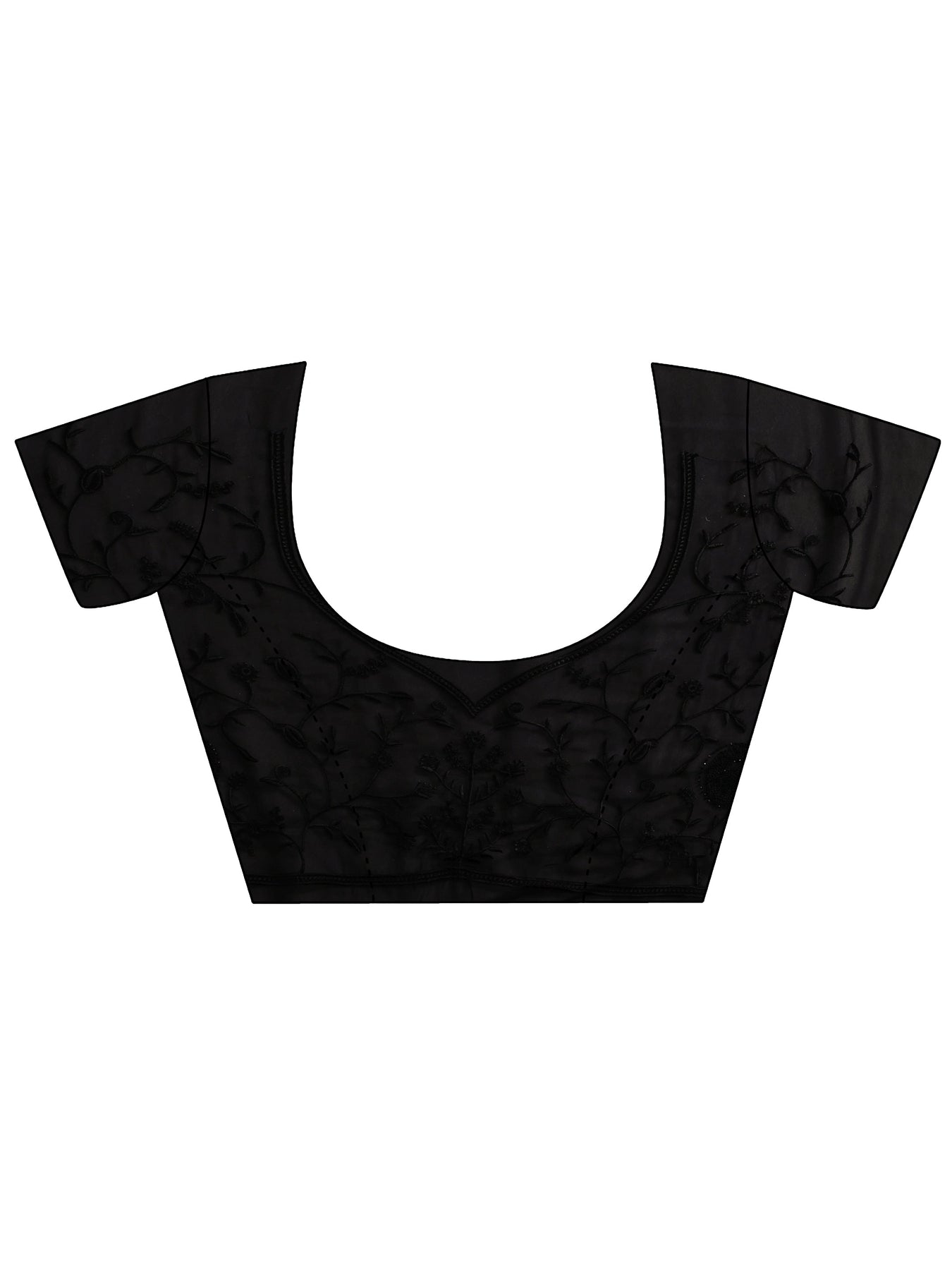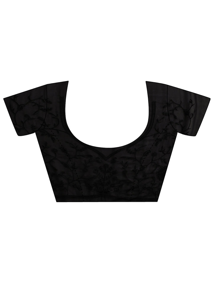 Our black printed silk blend saree features captivating embellishments. Complemented with a stitched blouse. This charming saree is perfect for special occasions.