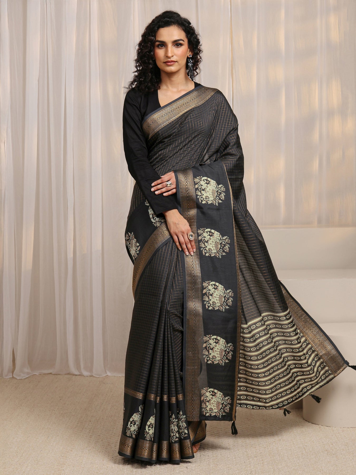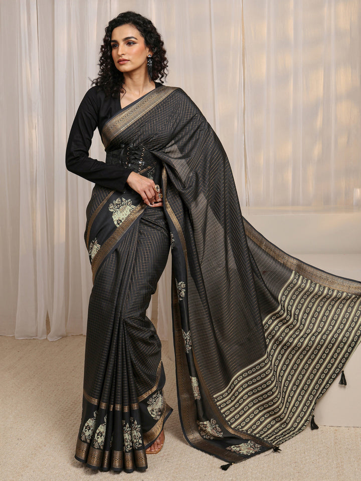 Our black printed silk blend saree features a captivating floral design inspired by traditional craftsmanship. Complemented with a Unstitched blouse piece. This charming saree is perfect for festive occasions.