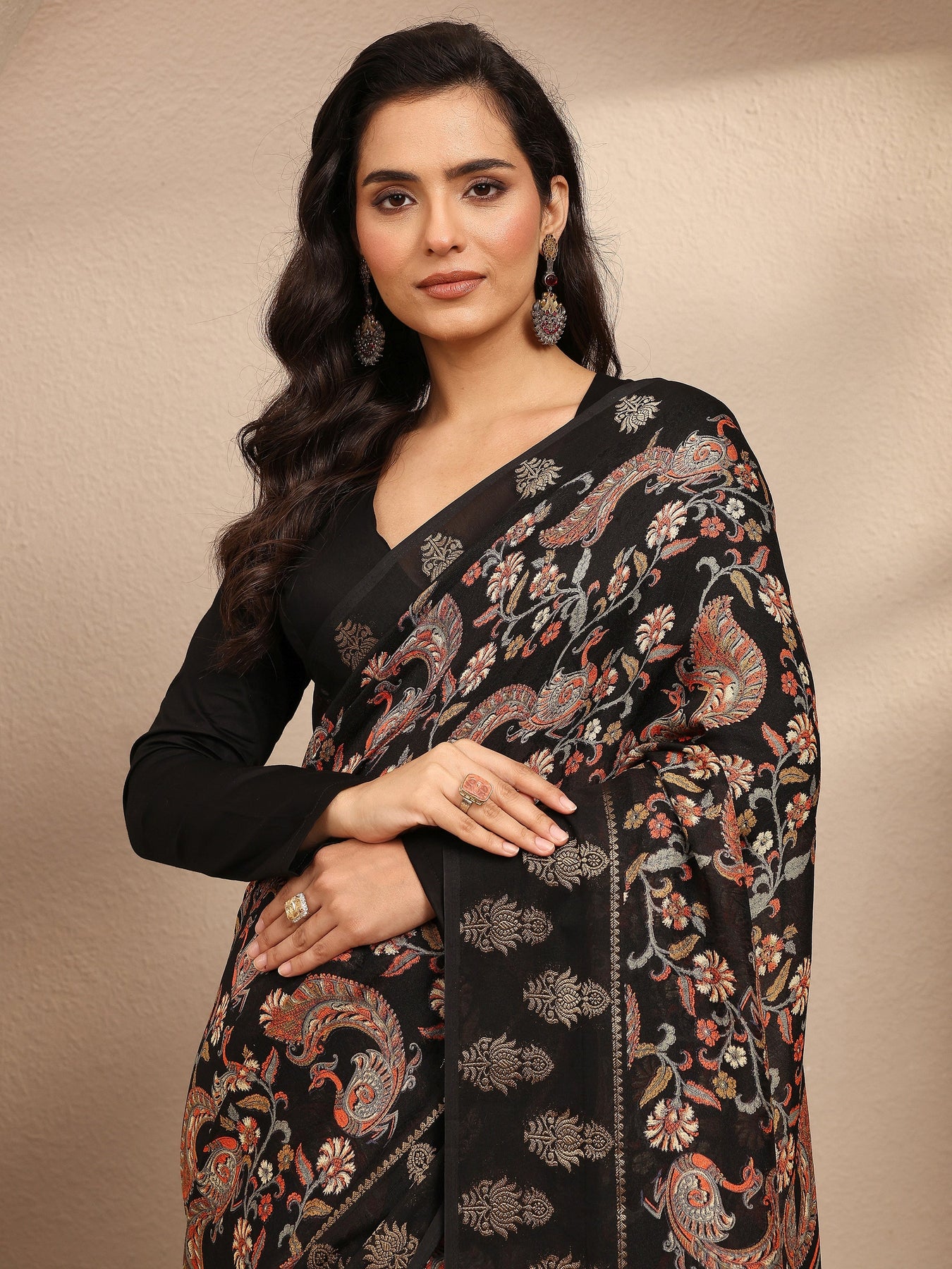 Black Printed Georgette Saree With Unstitched Blouse Piece