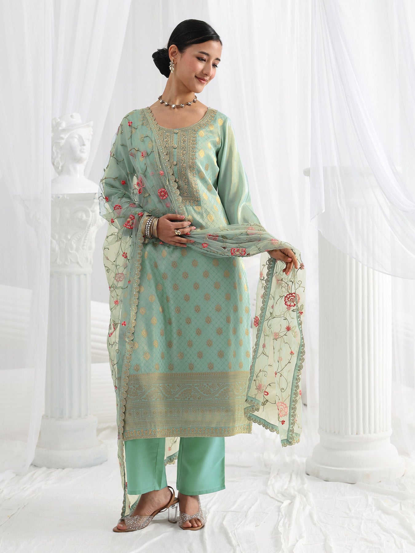 Our 3-piece sea green silk blend straight-fit kurta set features a round neckline, regular sleeves, and statement yoke. Complemented with straight pants with a partially elasticated waistband and an embroidered dupatta. Adorned with floral woven design, this style is perfect for festive occasions.