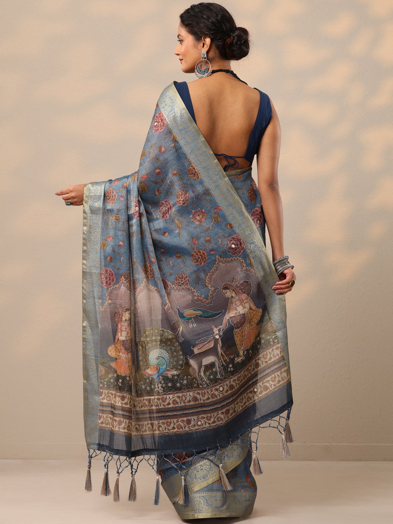 Our Blue printed cotton blend saree features captivating floral print. Complemented with a Blouse Piece. This charming saree is perfect for festive occasions.