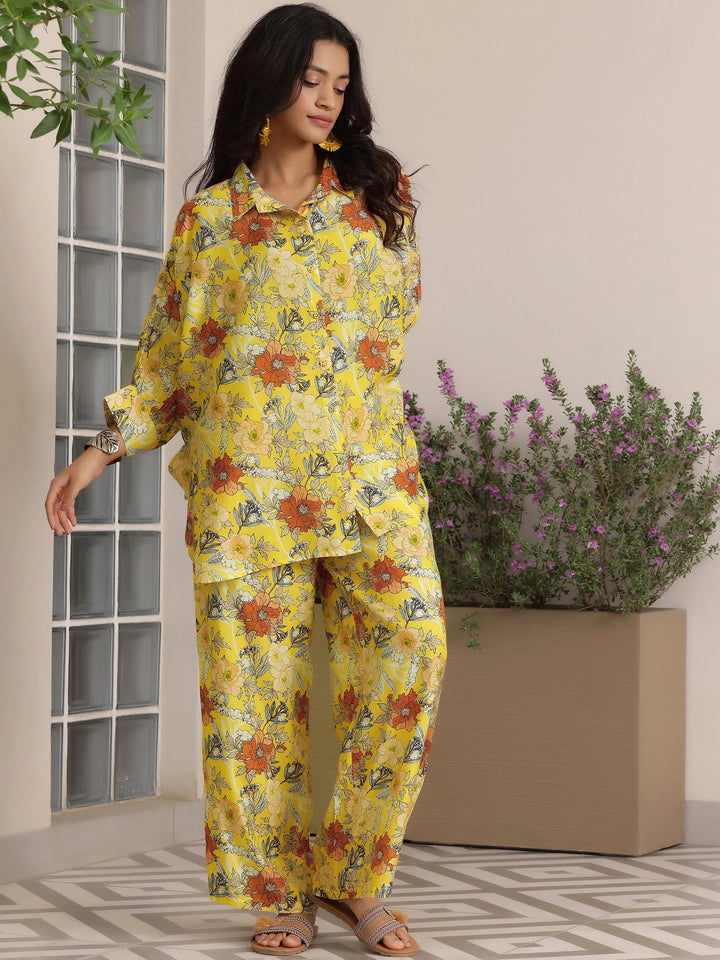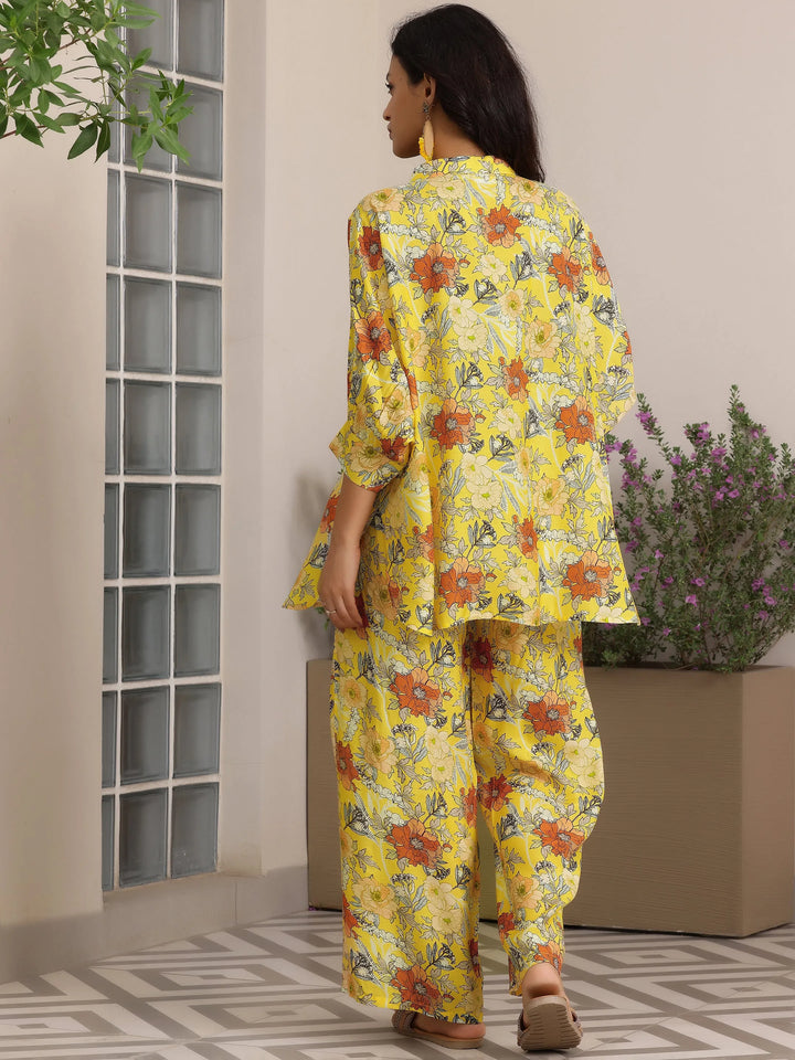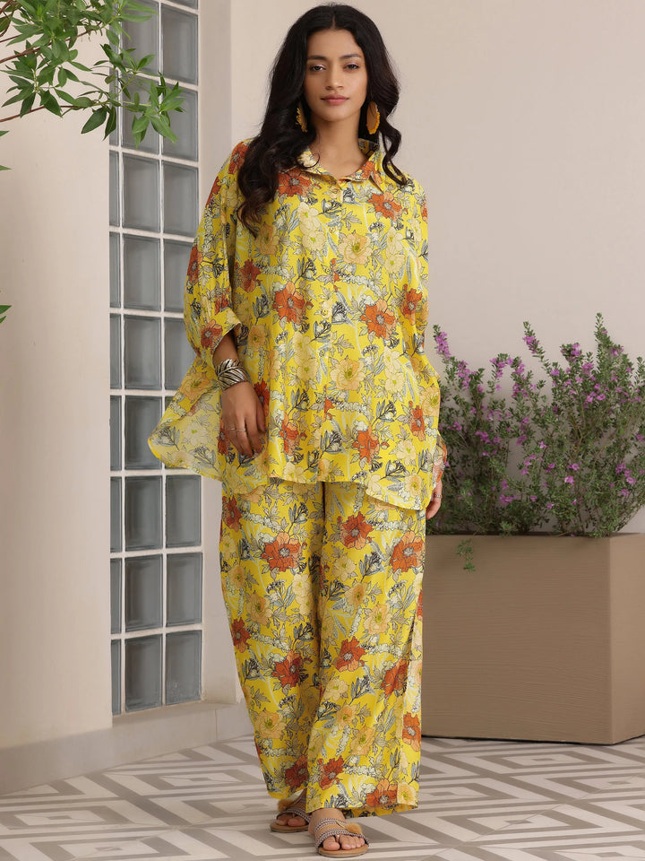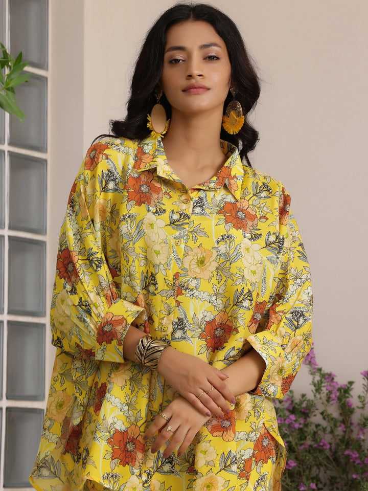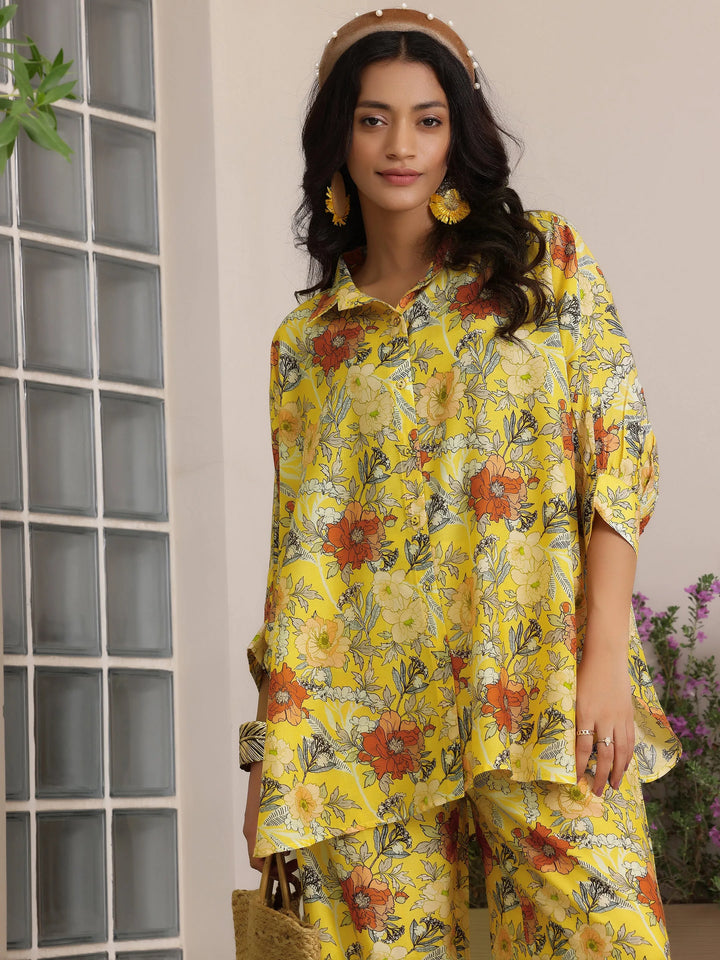 Our 2-piece yellow printed silk blend co-ord set features an asymmetrical kurti with a shirt collar with buttoned-down detailing and three-quarter bishop sleeves. Complemented with matching trousers with a partially elasticated waistband and roomy pockets. Adorned with floral prints and stylish buttons, this style is perfect for casual outings.