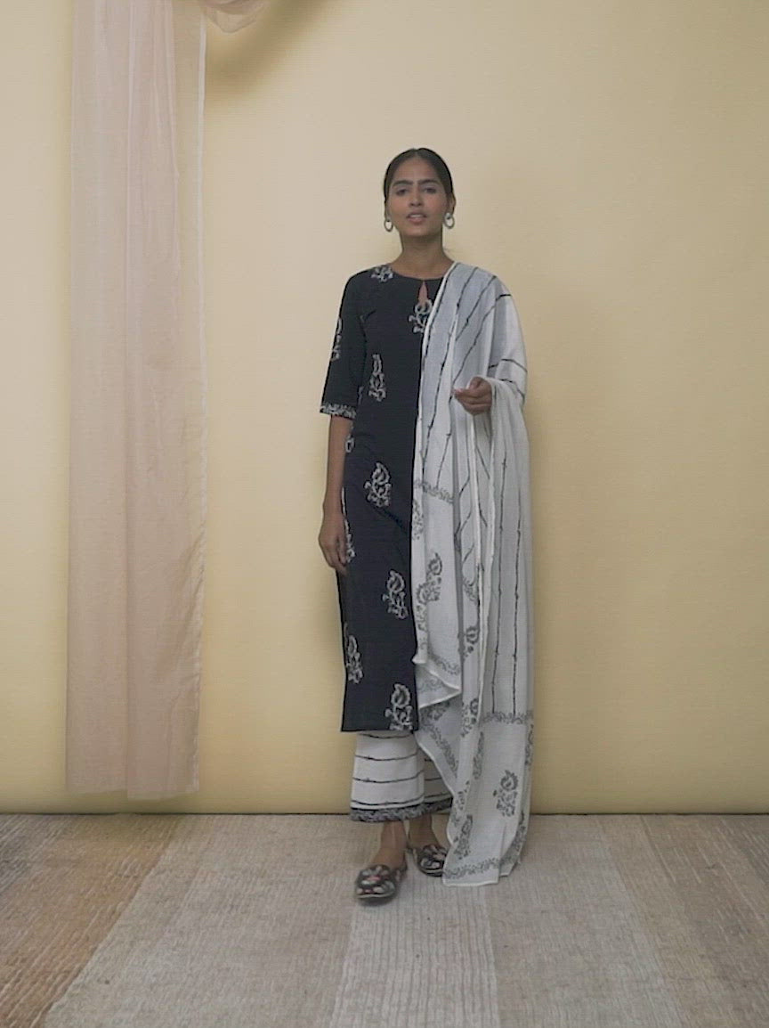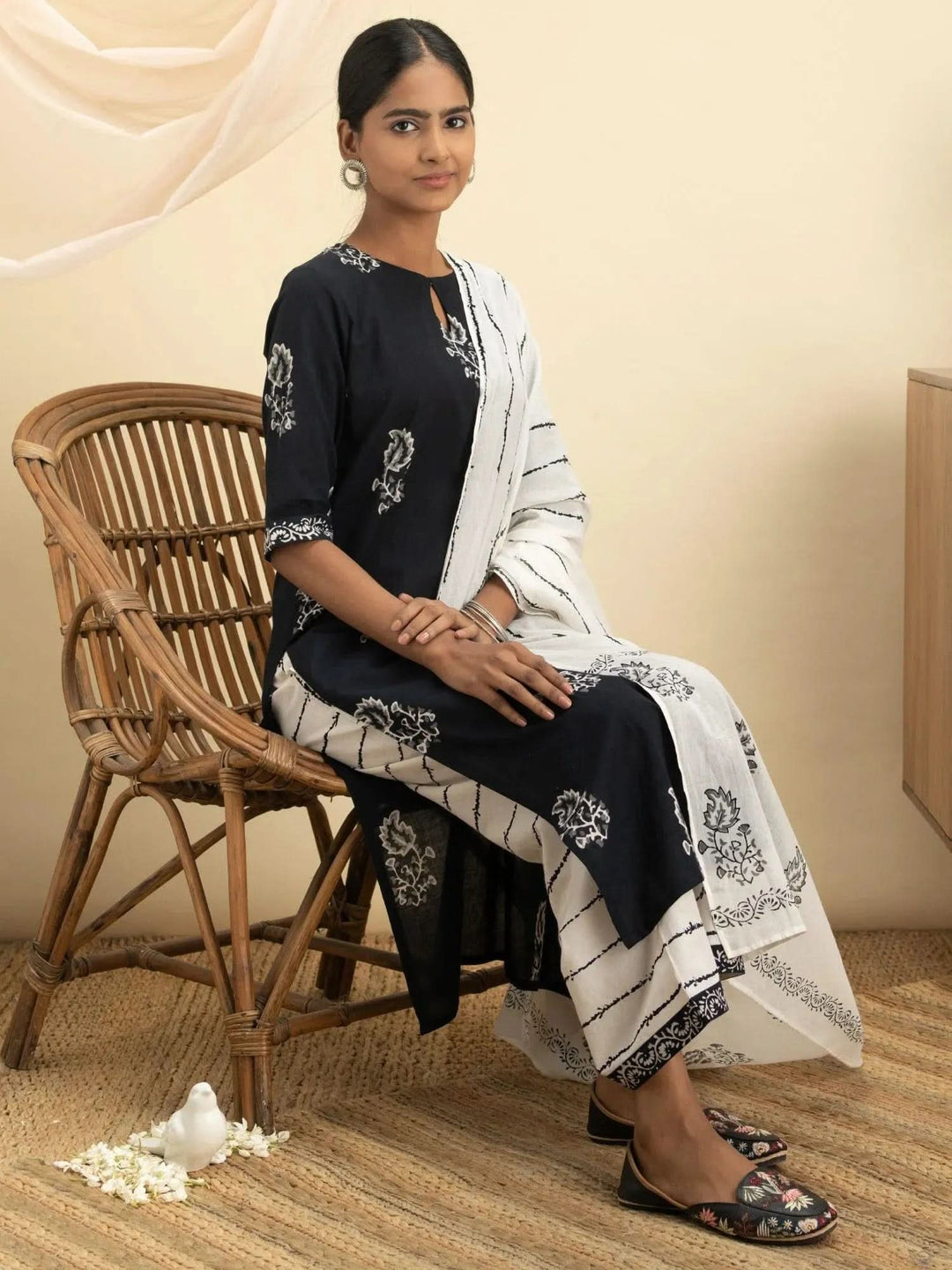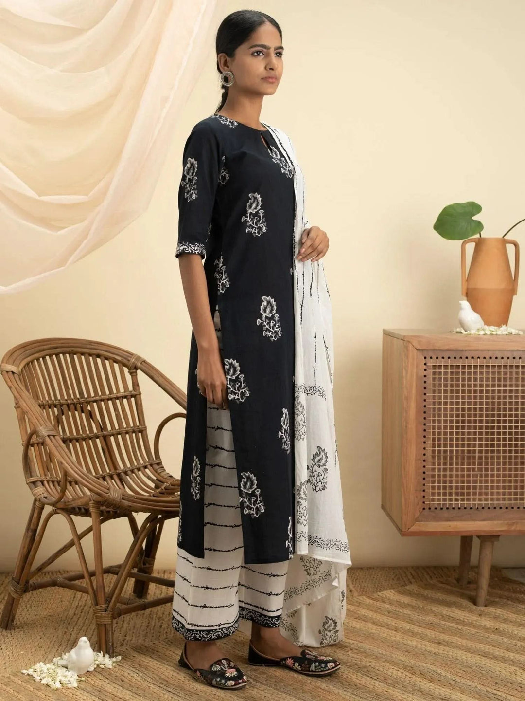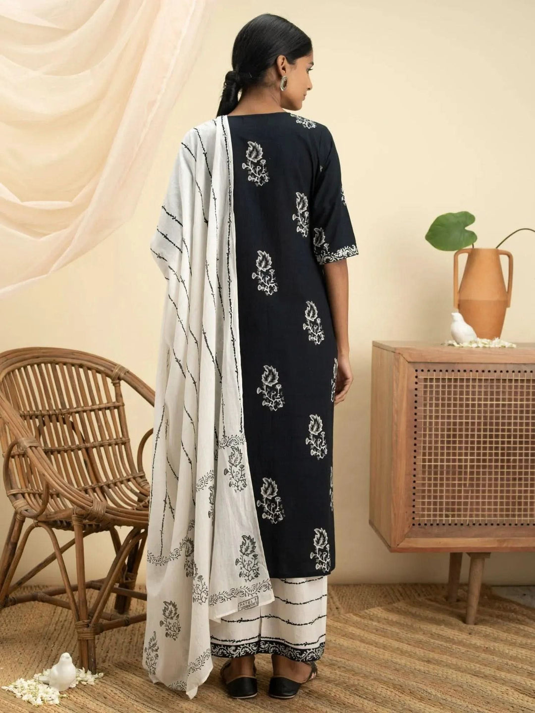 Black Printed Cotton Straight Kurta With Palazzos & Dupatta
