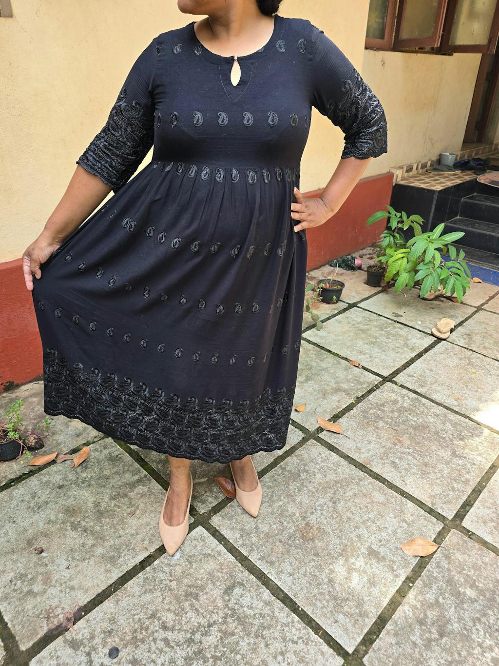 Our black A-line dress, crafted in rayon fabric, features a keyhole neckline, three-quarter sleeves, and a flared hemline. Adorned with laser-cut detailing and thread work, this style is perfect for casual outings.