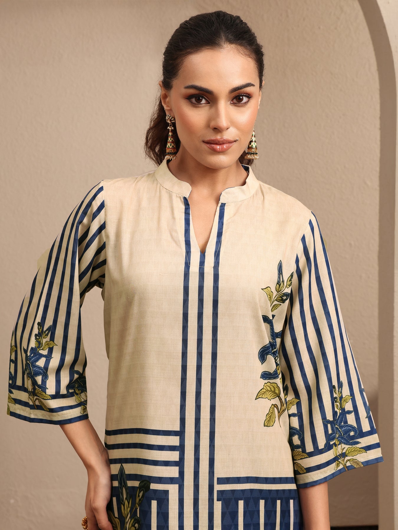 Our 2-piece Off White printed cotton blend co-ord set features a Straight-fit Tunic with a Mandarin Collar neckline and Three-quarter sleeves. Complemented with matching Palazzos with a Partially Elasticated waistband and 2 pockets. Highlighted with floral Print, this style is perfect for Casual Wear.