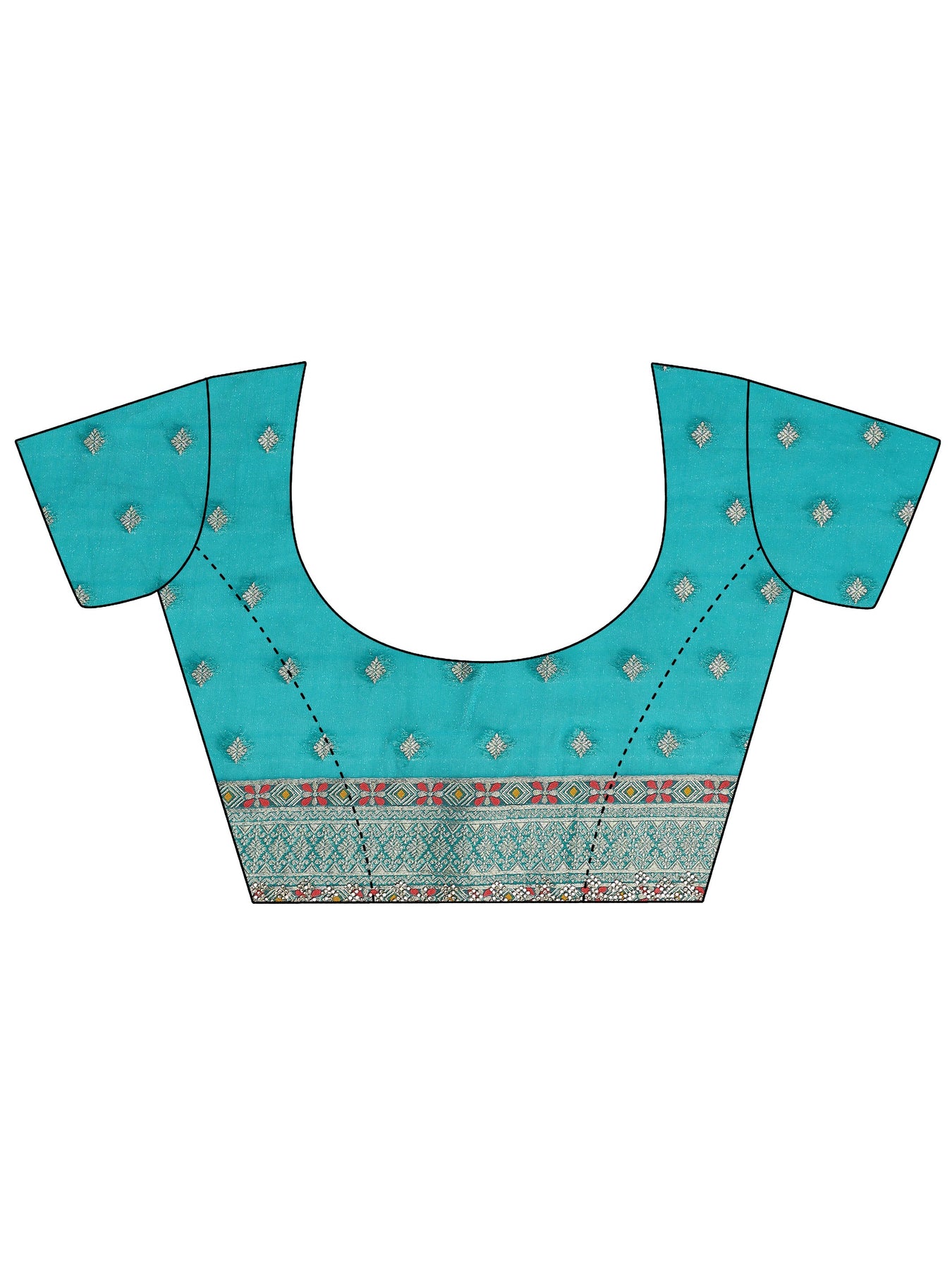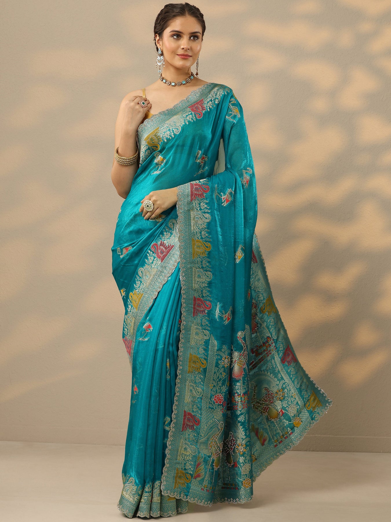 Our Turquoise Blue Printed Organza Saree Features Captivating Embellishments. Complemented With An Unstitched Blouse Piece. This Charming Saree Is Perfect For Festive Occasions