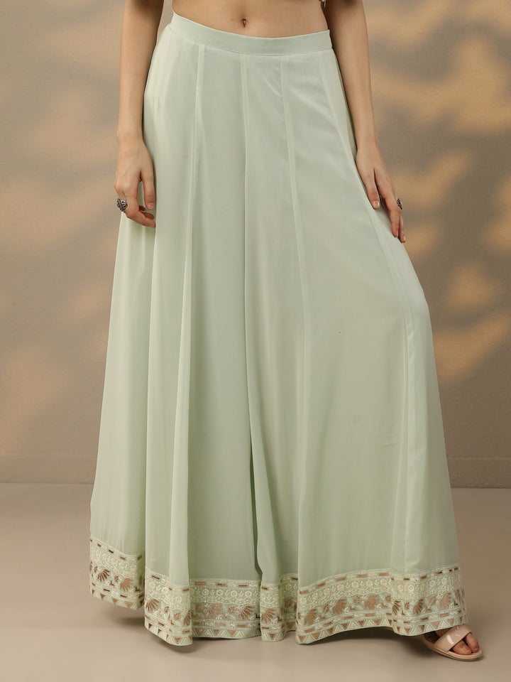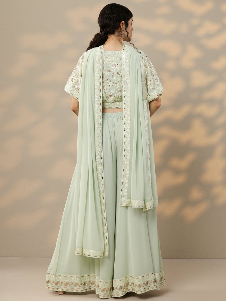 Our 3-piece green embroidered poly georgette co-ord set features an embellished V-neck crop top with short sleeves and pleated detailing. Complemented with flared palazzos with a partially elasticated waistband and a dupatta. Adorned with intricate thread work and sequins, this charming style is perfect for light festivities.