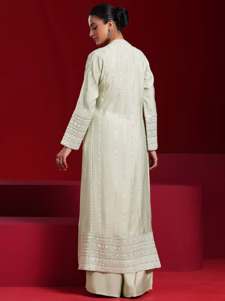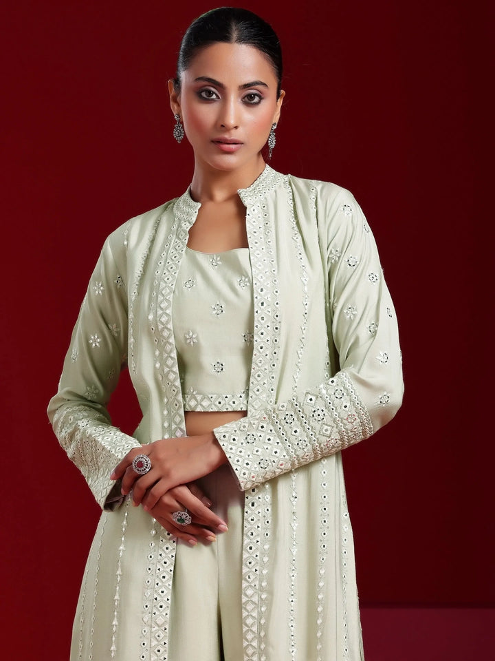 Our 3-piece grey embroidered silk blend co-ord set features a sleeveless crop top. Complemented with flared palazzo pants and a mandarin collar longline open jacket. Adorned with intricate thread work and mirror work, this style is perfect for light festivities.