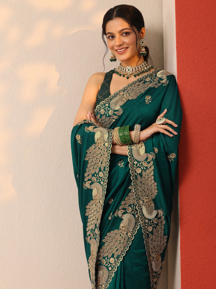 Teal  Embroidered Silk Blend Sarees With Unstitched Blouse Piece