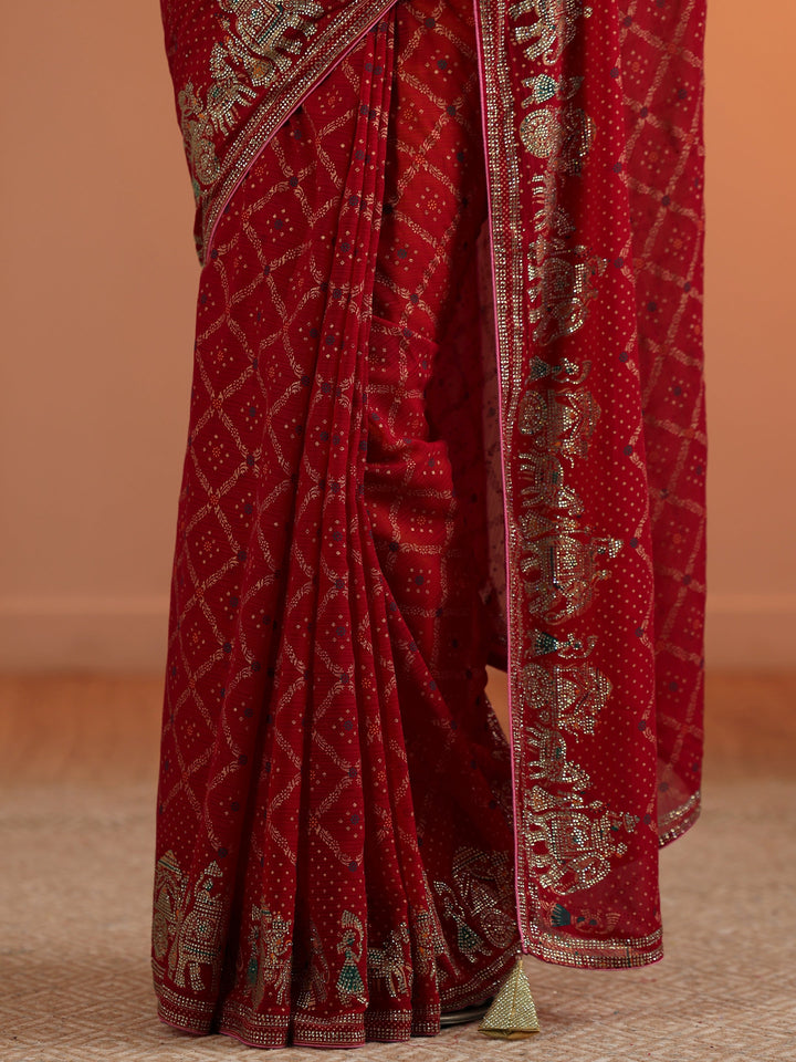 Our Red Printed Georgette Saree. Complemented With A Unstitched Blouse Piece. This Charming Saree Is Perfect For Festive Wear