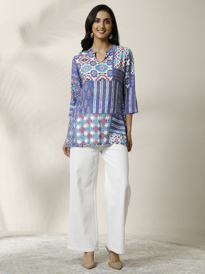 Our 1-piece blue muslin straight-fit kurta features a mandarin collar, regular sleeves. Adorned with block printed, this style is perfect for work wear and casual wear.