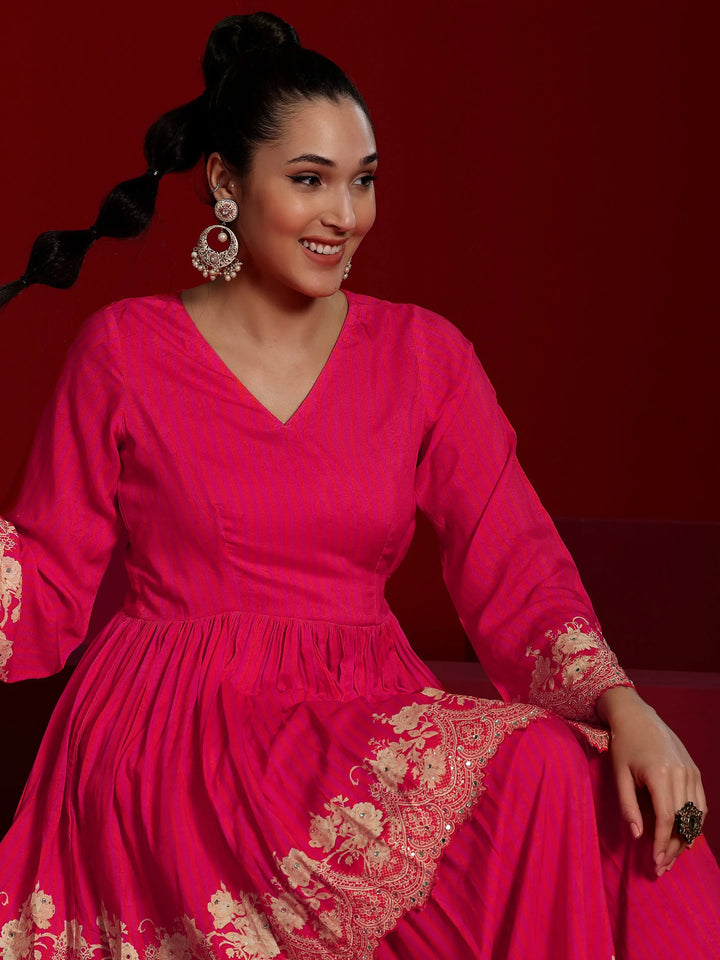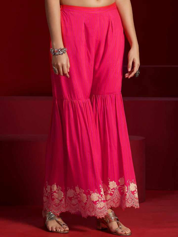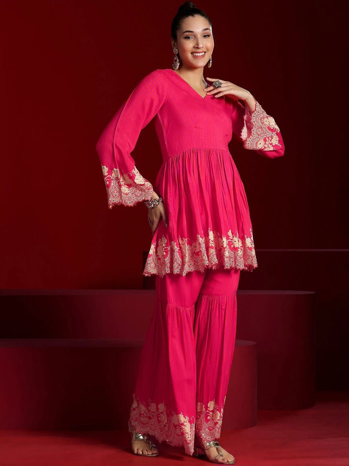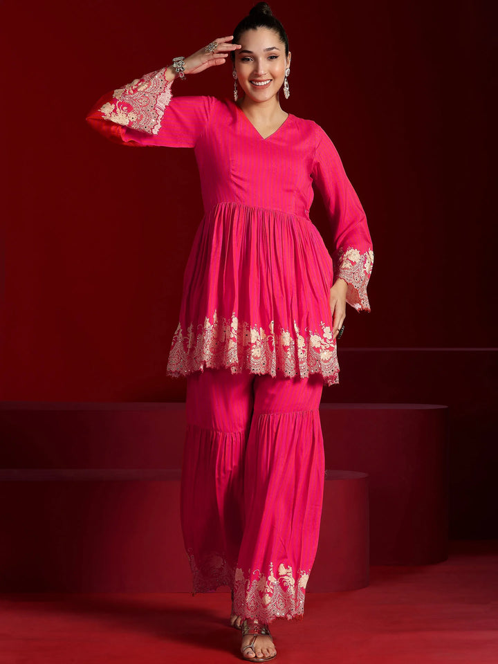 Our 2-piece Pink printed Muslin co-ord set features a Fit and flare Tunic with a V-Neck neckline and Long Sleeves. Complemented with matching Palazzos with an Elasticated waistband. Highlighted with Printed, this style is perfect for Festive.