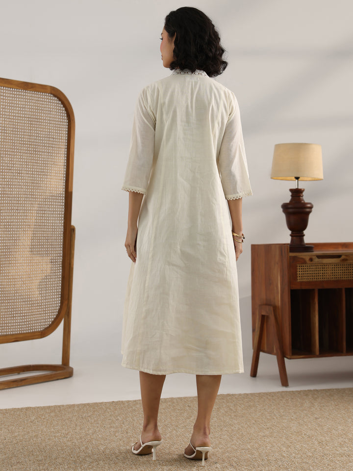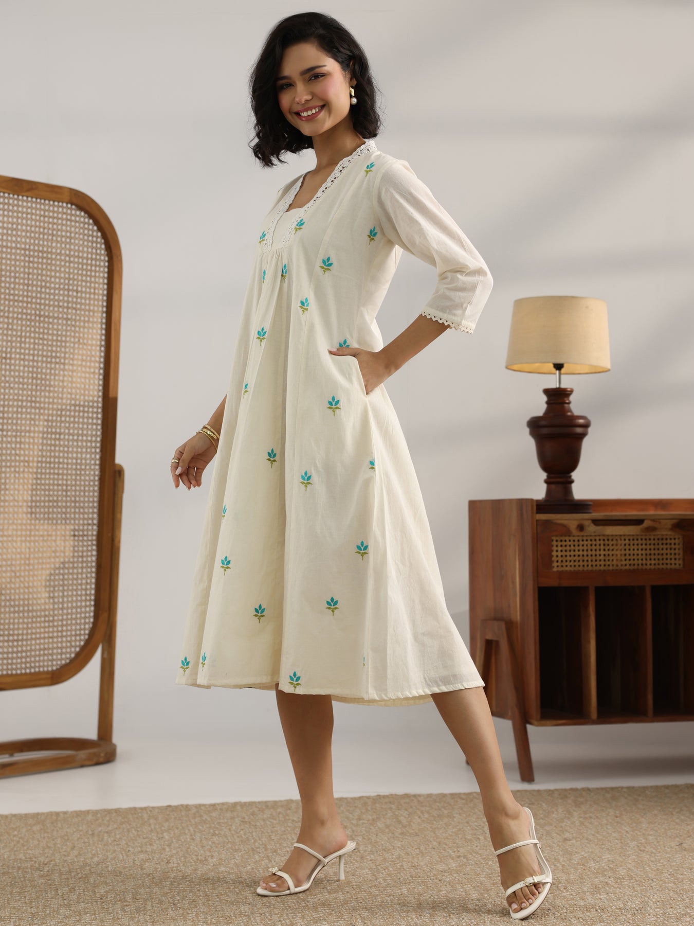 Off White Printed Cotton Pleated A-Line One Piece Dress