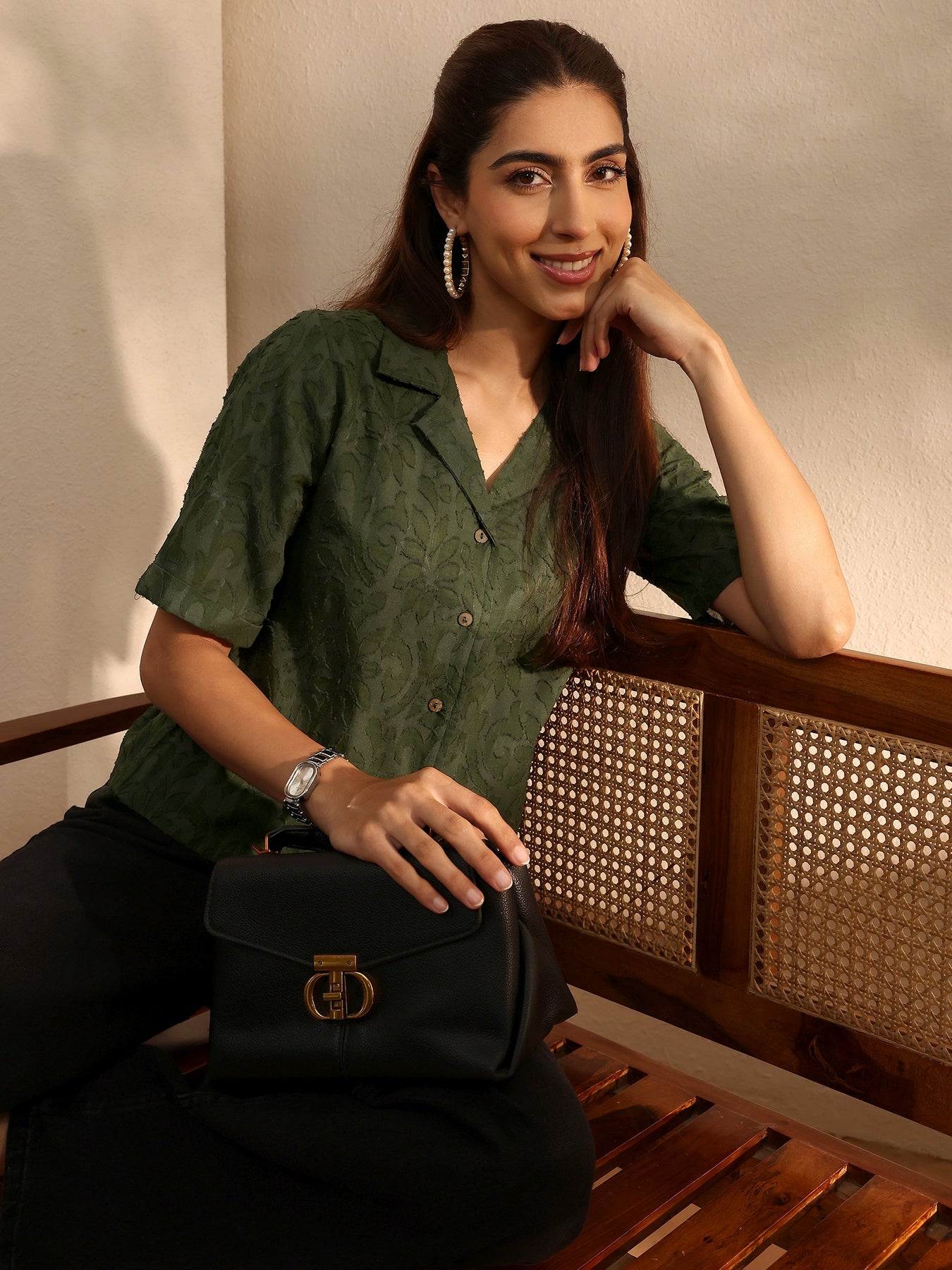 Our 1-piece olive cotton straight-fit top features a Mandarin neckline, regular sleeves, and statement yoke. Adorned with floral thread work, this style is perfect for work wear and casual wear.