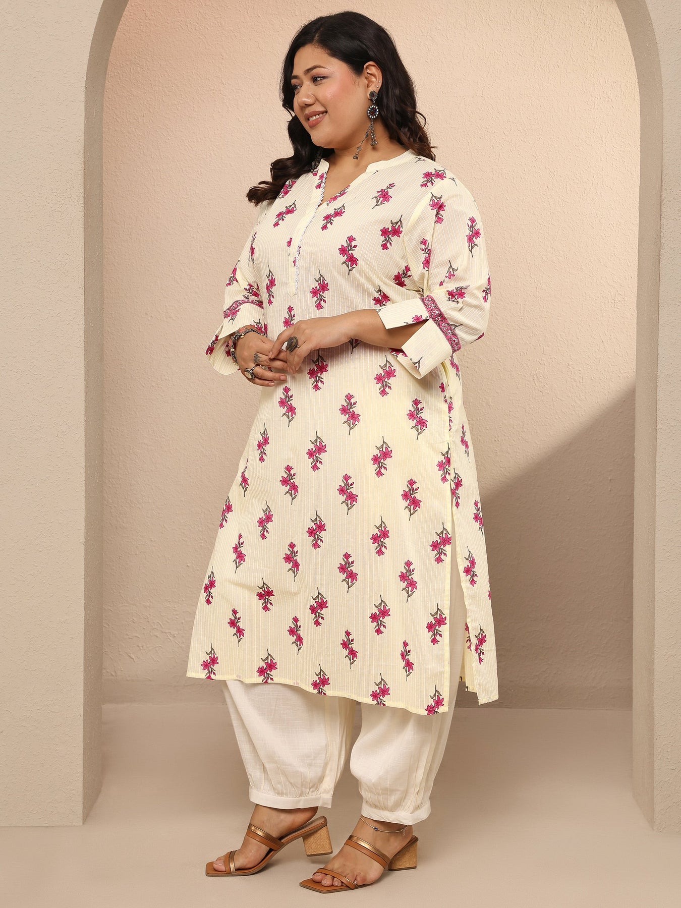 Our 1-piece off white cotton straight-fit kurta features a mandarin collar neckline, regular sleeves and statement Yoke. Adorned with floral print, this style is perfect for work wear and casual wear.
