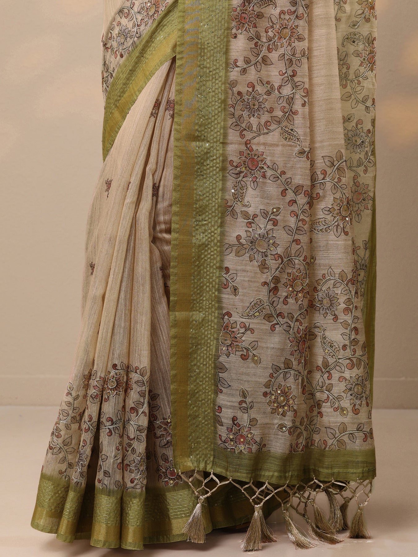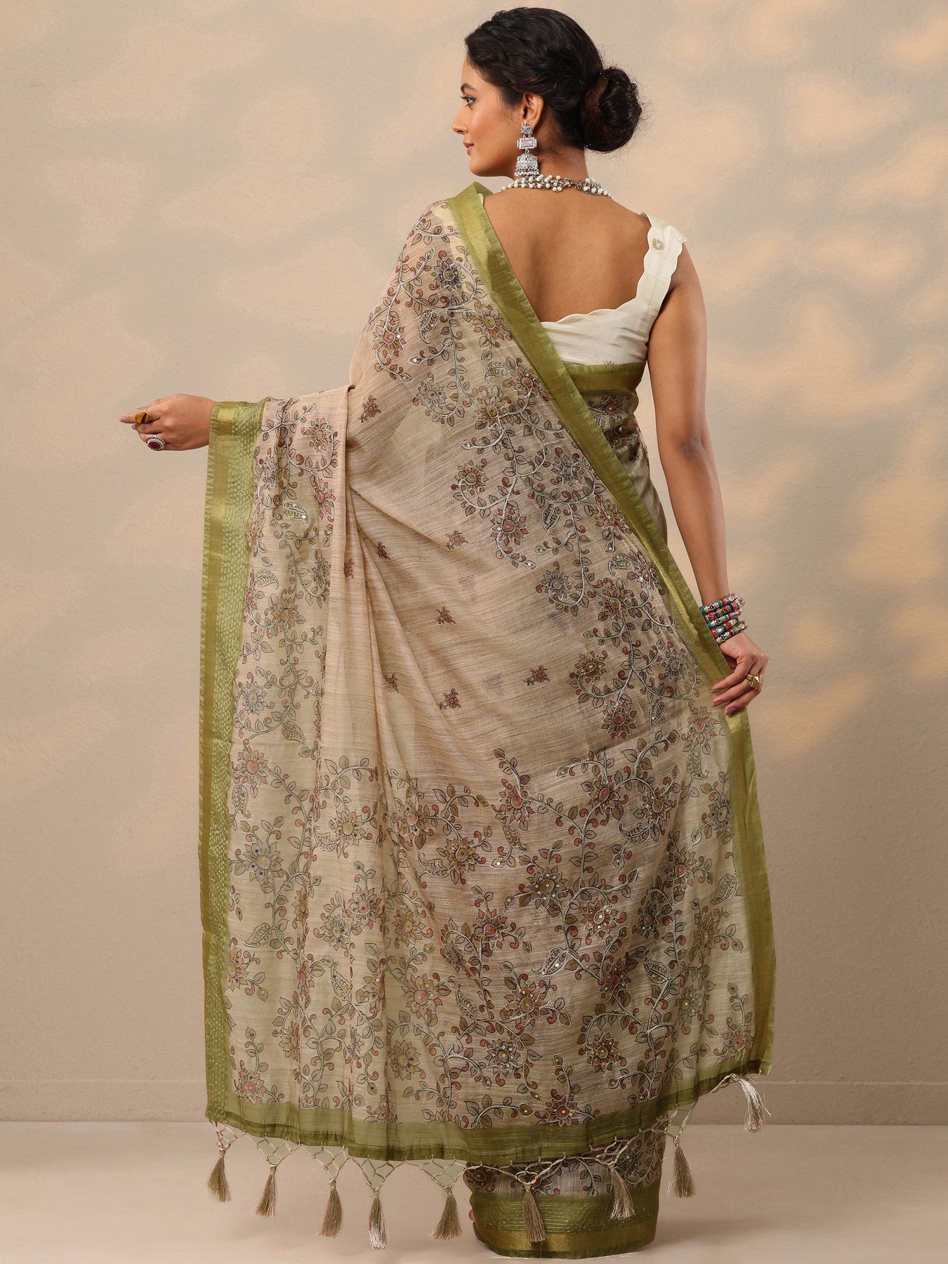 Our beige printed cotton blend saree features captivating floral print. Complemented with a blouse piece. This charming saree is perfect for festive occasions.