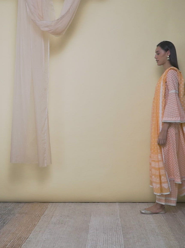 Peach Printed Cotton Anarkali Kurta With Palazzos & Dupatta