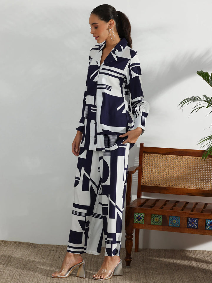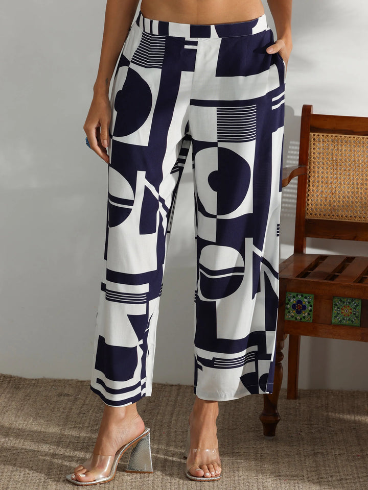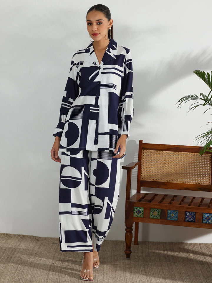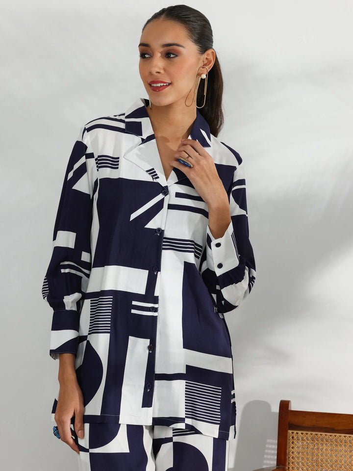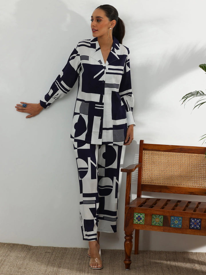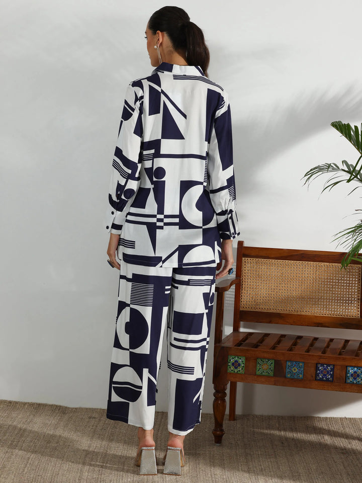 Our 2-piece white printed rayon co-ord set features a shirt-style tunic with a buttoned-down detailing and full-length bishop sleeves. Complemented with matching trousers with a partially elasticated waistband and roomy pockets. Elevated with stylish button accents and geometric prints, this style is perfect for casual outings.