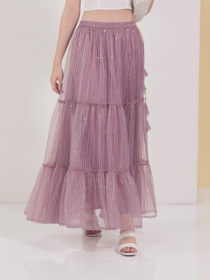 Our mauve striped fluid skirt features tie-up details on the torso, side seams, and sleeves. Adorned with a striped pattern and flared hemline, this design is perfect for light festivities.