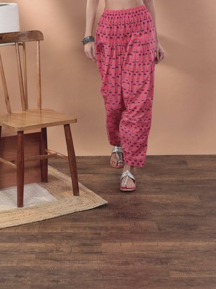 Our pink cotton salwar features a partially elasticated waistband with slip-on closure and pleated details. Adorned with a floral print, this refreshing style is perfect for elevated everyday wear.