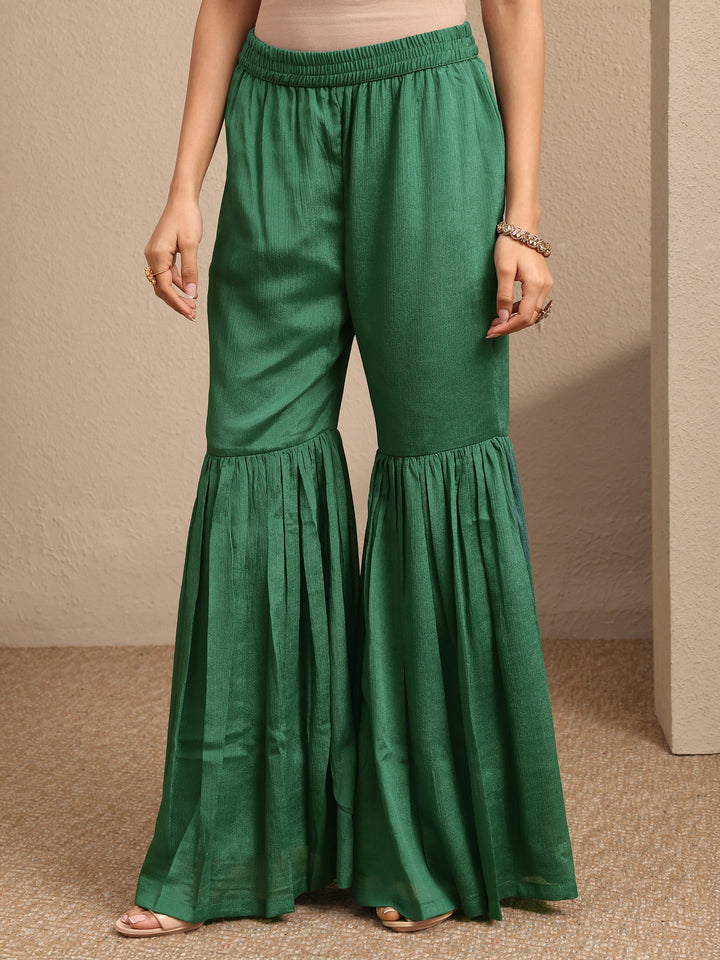 Our 3-piece green Chinon kurta set features a straight-fit design with a round neckline, regular sleeves, and statement yoke. Complemented with Sharara pants with a partially elasticated waistband and an embroidered dupatta. Adorned with bandhani printed, this style is perfect for Dark Festive occasions.