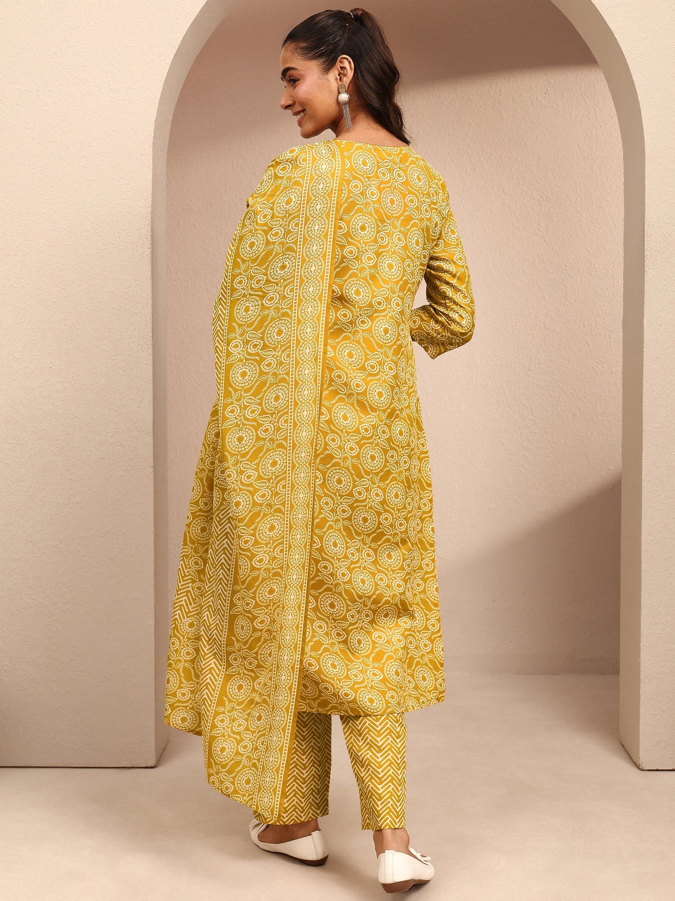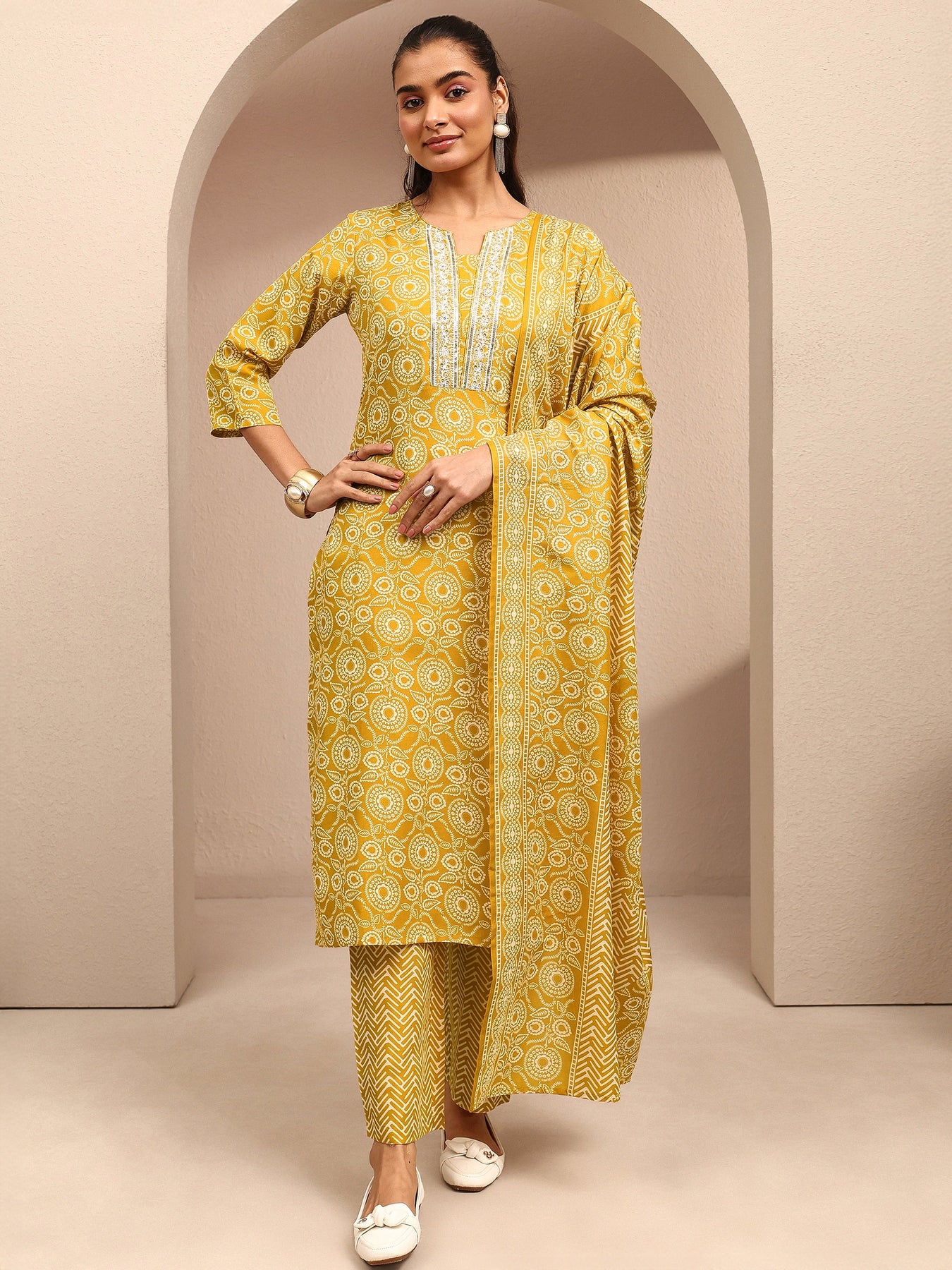 Mustard Printed Cotton Blend Straight Suit Set With Dupatta