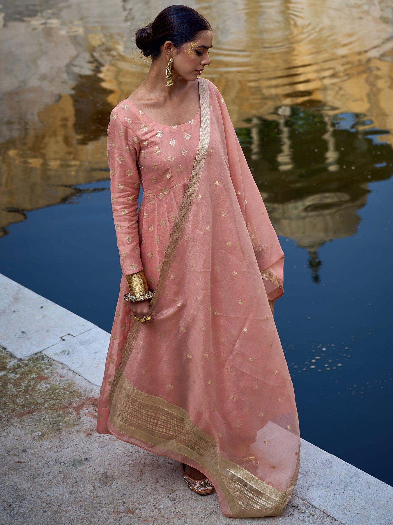 Our 3-piece peach silk blend Anarkali kurta set features a round neckline, regular sleeves, and a statement flared yoke. Complemented with lining and straight pants with a partially elasticated waistband and 2 pockets, and an embroidered dupatta. Adorned with woven design embellishments, this style is perfect for festive wear.
