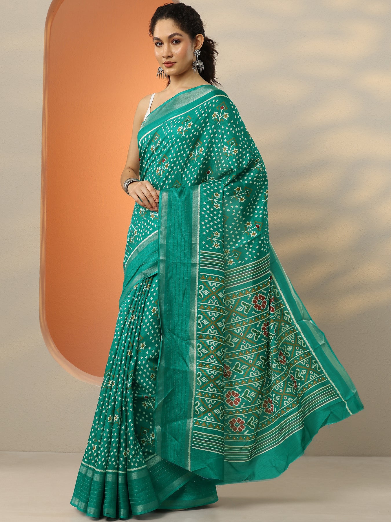 Green Printed Silk Blend Saree With Unstitched Blouse Piece