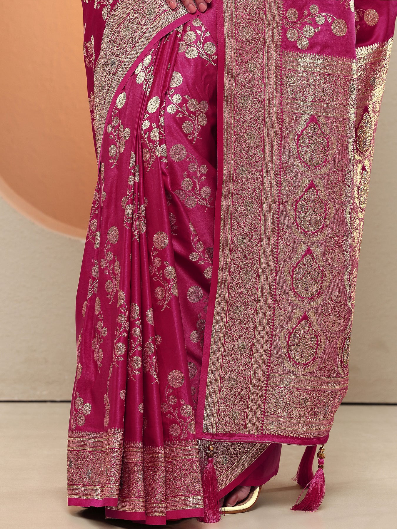 Our Pink Floral Woven Design Silk Blend Saree. Complemented With An Unstitched Blouse Piece. This Charming Saree Is Perfect For Festive Occasions.