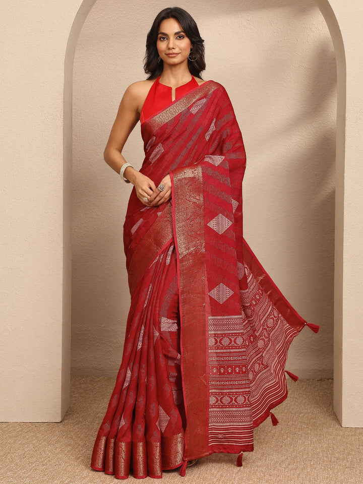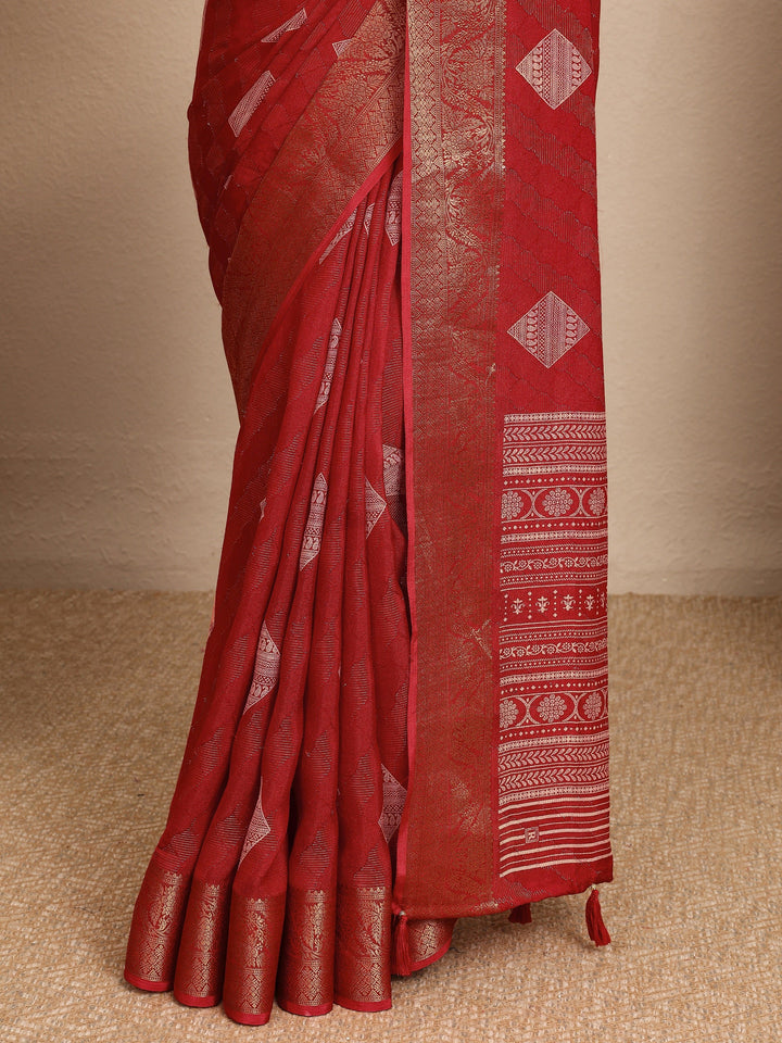 Our Red printed Georgette saree features captivating geometric print. Complemented with a Stitched Blouse. This charming saree is perfect for festive occasions.
