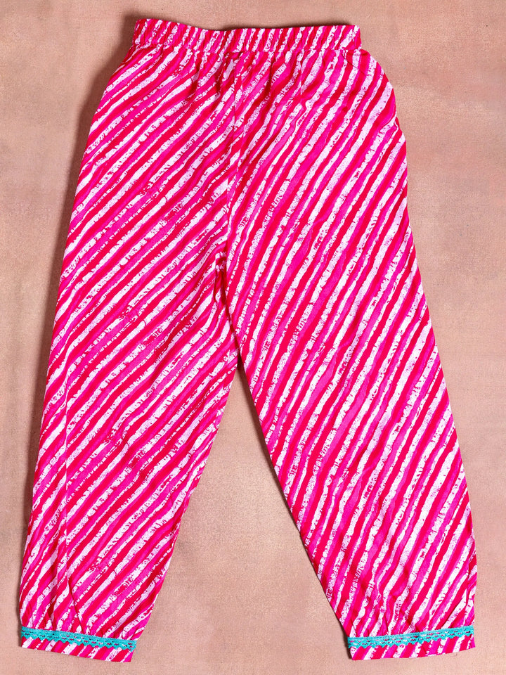 Our 2-piece kids pink printed cotton co-ord set features a sleeveless top with a round neckline. Complemented with striped trousers with a fully elasticated waistband. Elevated with Bandhani and Leheriya prints and lace detailing, this style is perfect for festive celebrations.