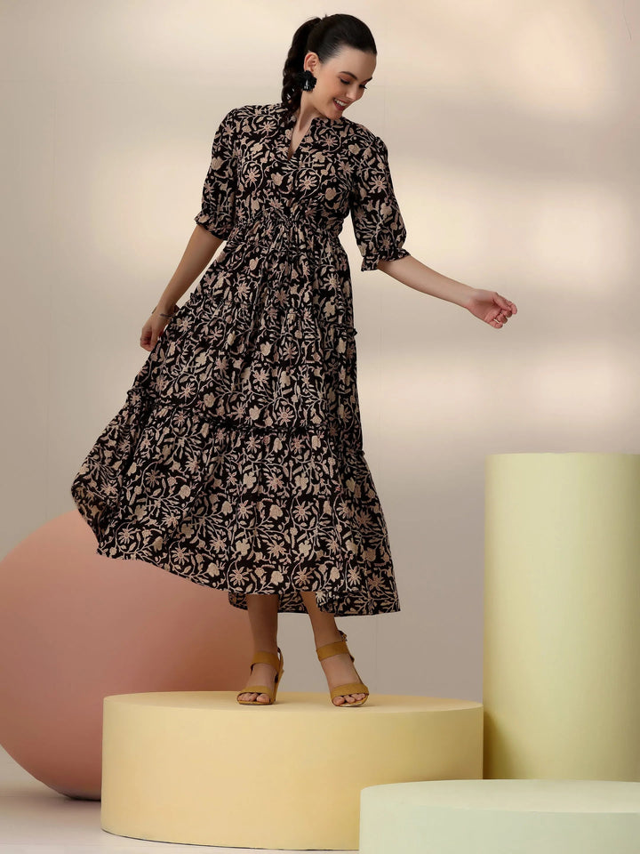 Our black printed cotton fit and flare dress, features a mandarin notched neckline, short puff sleeves, and a drawstring closure at the waist. Elevated with captivating floral prints and ruffled hemline, this style is perfect for casual outings.