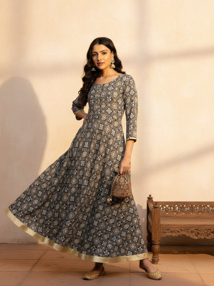 Our grey floral print fit and flare dress, crafted in soft rayon fabric features a round neckline, three-quarter sleeves and a flared hemline. Adorned with delicate fabric-trim accents, this charming style is perfect for casual outings.