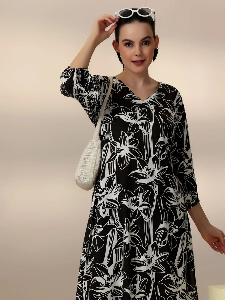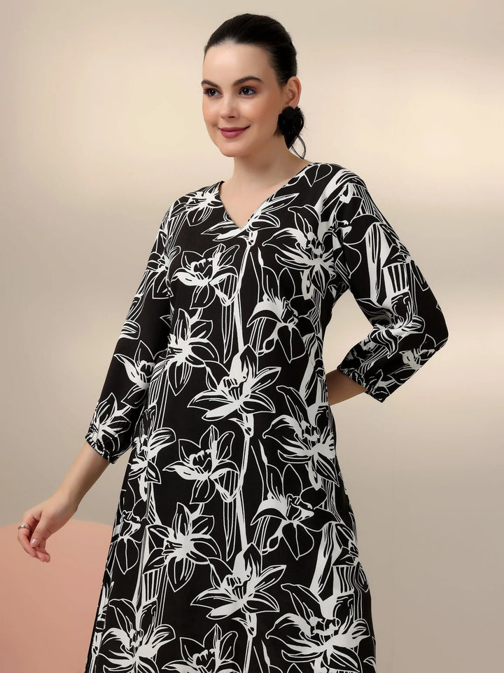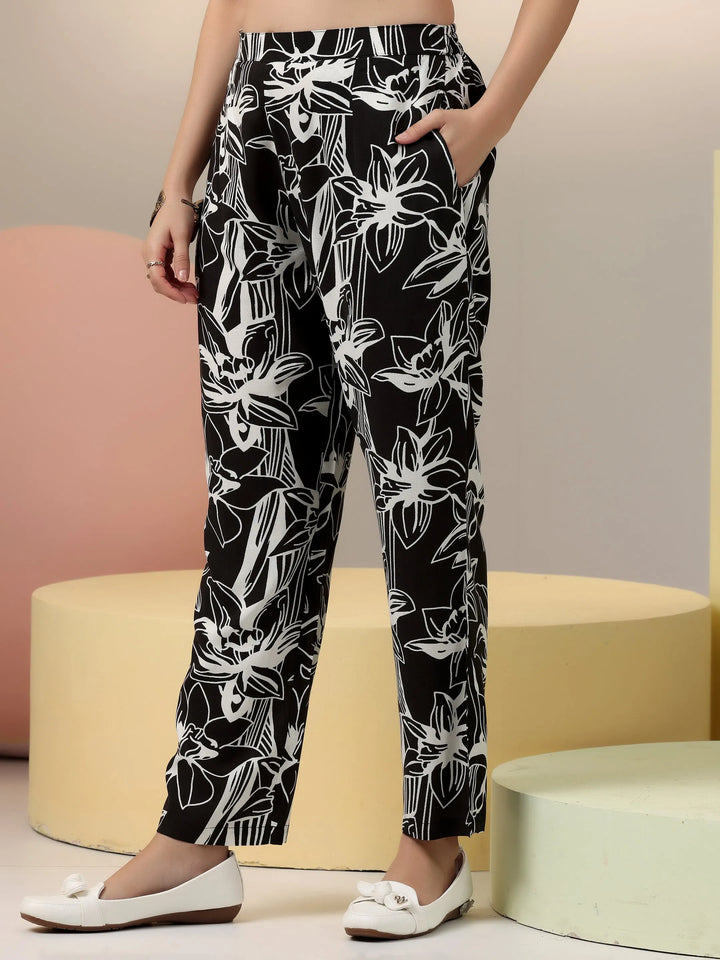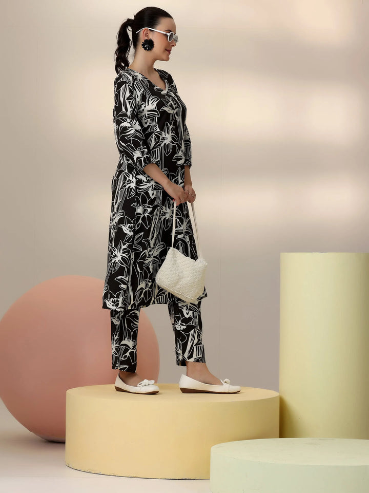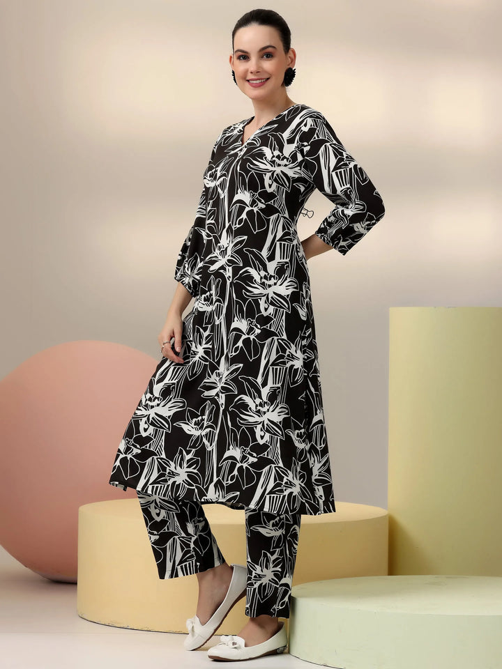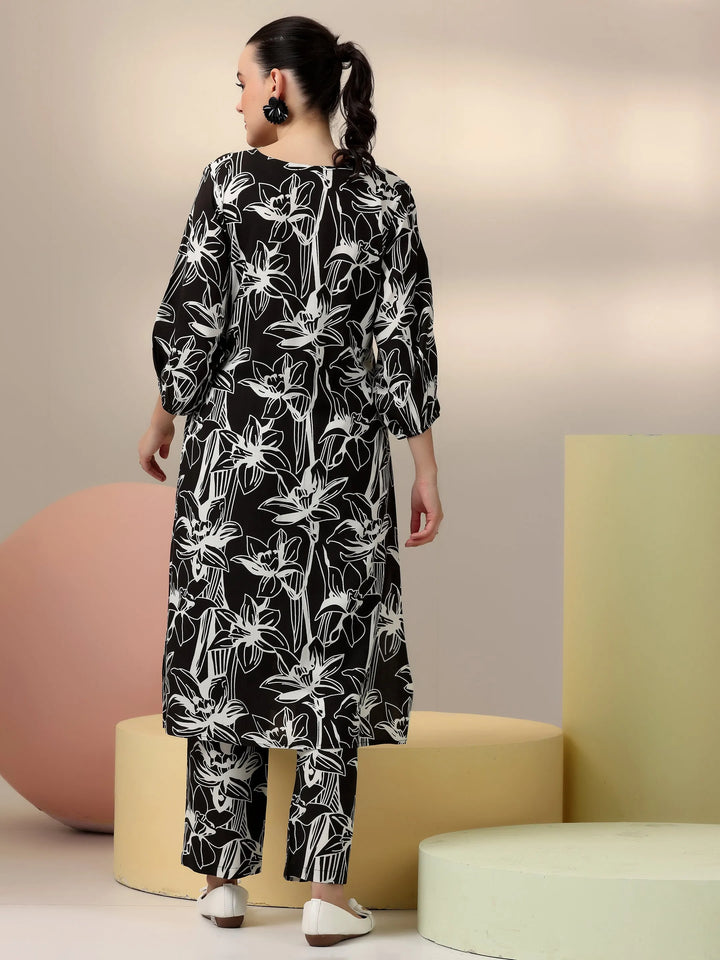 Our 2-piece black printed rayon co-ord set features an A-line kurta with a V-neckline and three-quarter bishop sleeves. Complemented with trousers with a partially elasticated waistband and roomy pockets. Elevated with captivating floral prints, this style is perfect for casual outings.