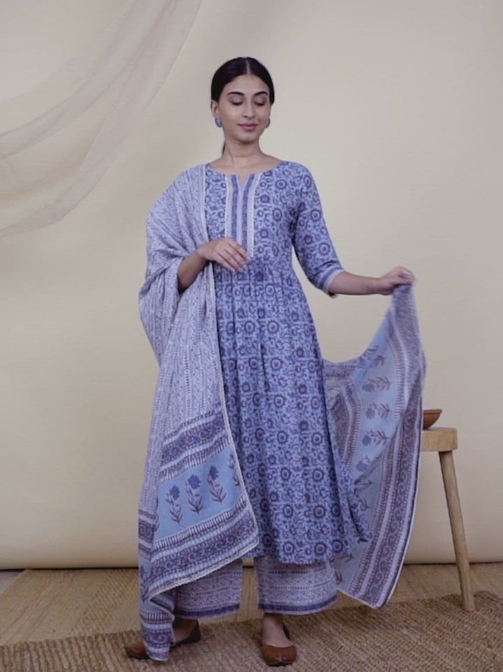 Blue Printed Cotton Anarkali Kurta With Palazzos & Dupatta
