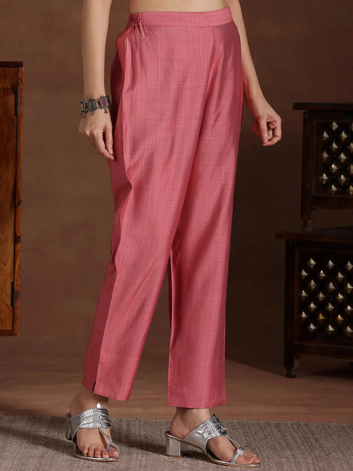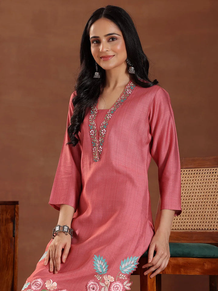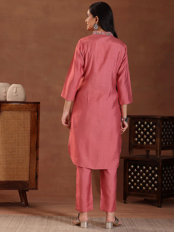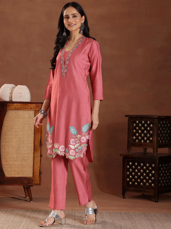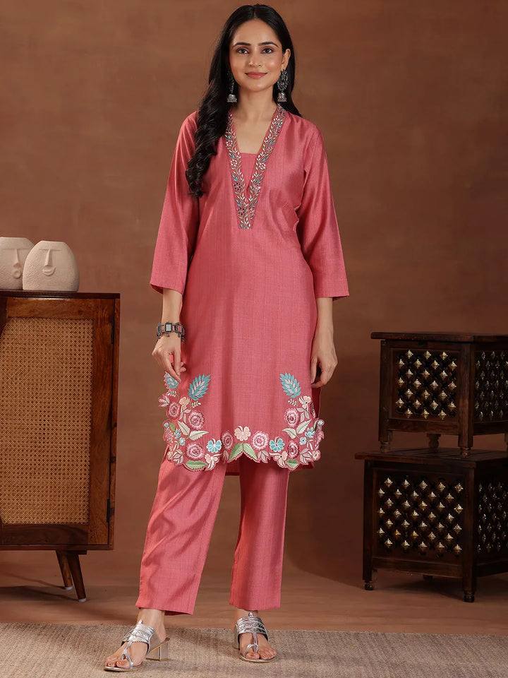 Coral Embroidered Silk Blend Co-Ords